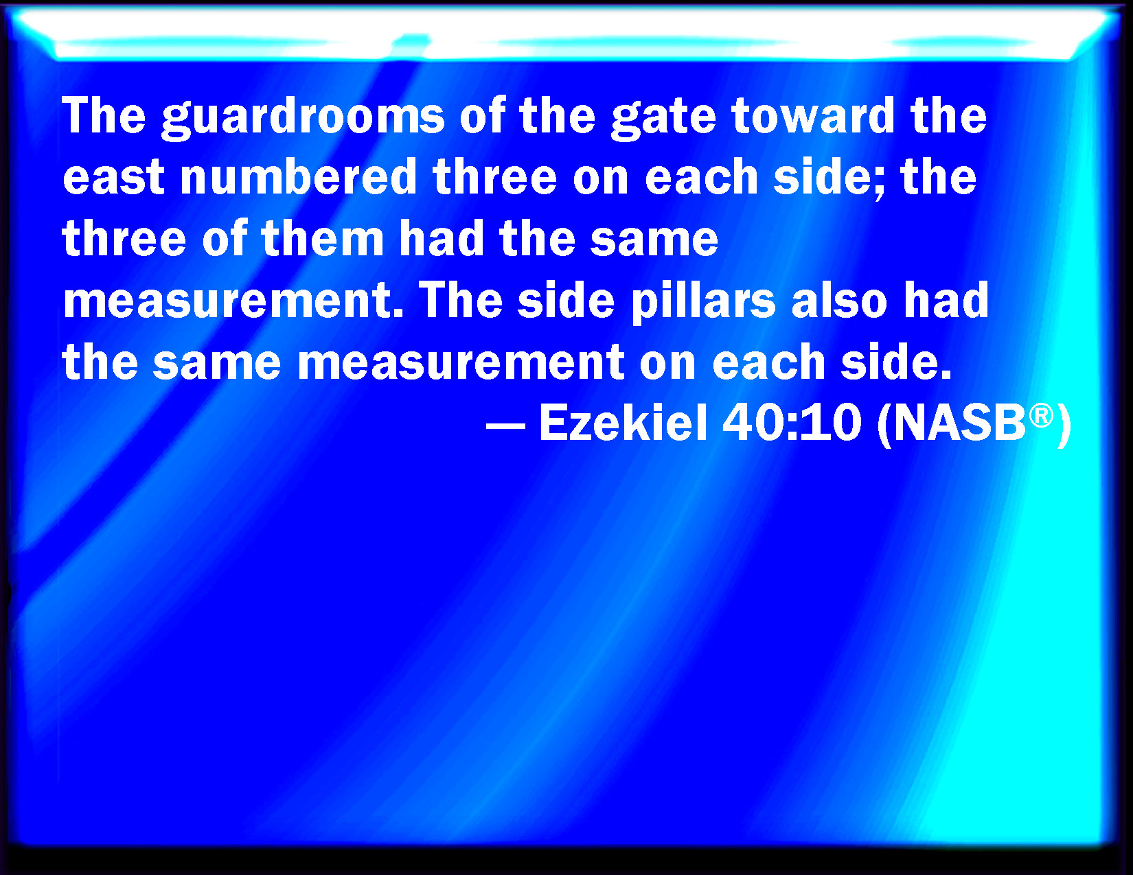 Bible Verse Slide Ezekiel 40:10 And the little chambers of the gate eastward were three on this side, and three on that side; they three were of one measure: and the posts had one measure on this side and on that side. KJV: And the little chambers of the gate eastward were three on this side, and three on that side; they three were of one measure: and the posts had one measure on this side and on that side. DRB: And the little chambers of the gate that looked eastward were three on this side, and three on that side: all three were of one measure, and the fronts of one measure, on both parts. DBT: And the chambers of the gate which was toward the east were three on this side and three on that side: they three were of one measure; and the posts on this side and on that side had one measure. ERV: And the lodges of the gate eastward were three on this side, and three on that side; they three were of one measure: and the posts had one measure on this side and on that side. WBT: And the little chambers of the gate eastward were three on this side, and three on that side; they three were of one measure: and the posts had one measure on this side and on that side. WEB: The lodges of the gate eastward were three on this side, and three on that side; they three were of one measure: and the posts had one measure on this side and on that side. YLT: and the little chambers of the gate eastward, three on this side, and three on that side; one measure is to them three, and one measure is to the posts, on this side and on that side.Links Ezekiel 40:10 NIV • Ezekiel 40:10 NLT • Ezekiel 40:10 ESV • Ezekiel 40:10 NASB • Ezekiel 40:10 KJV • Ezekiel 40:10 Interlinear • Ezekiel 40:10 Commentaries • Ezekiel 40:10 Parallel Texts • Ezekiel 40:10 Bible Apps • Ezekiel 40:10 Parallel • Bible Hub |