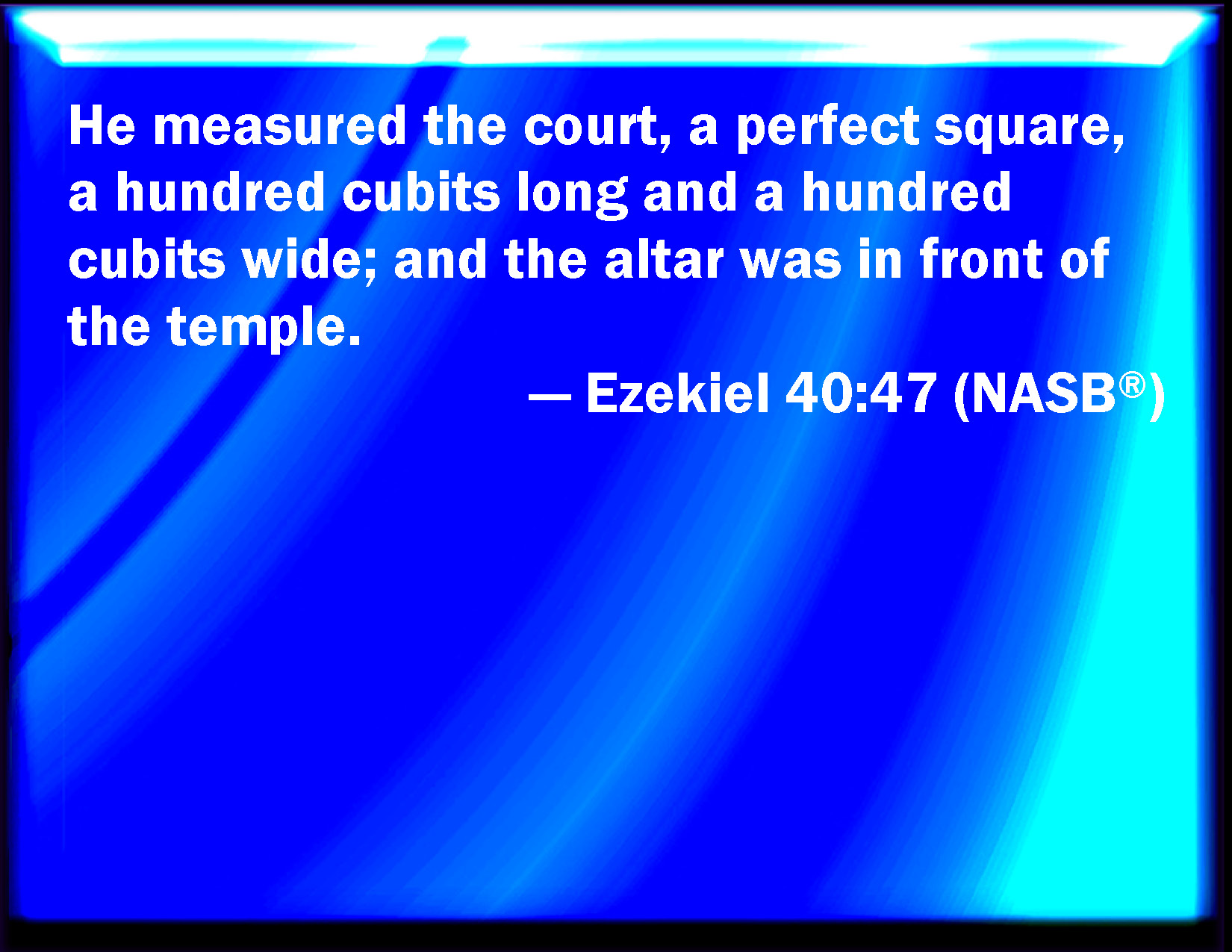 Bible Verse Slide Ezekiel 40:47 So he measured the court, an hundred cubits long, and an hundred cubits broad, foursquare; and the altar that was before the house. KJV: So he measured the court, an hundred cubits long, and an hundred cubits broad, foursquare; and the altar that was before the house. DRB: And he measured the court a hundred cubits long, and a hundred cubits broad foursquare: and the altar that was before the face of the temple. DBT: And he measured the court, the length a hundred cubits, and the breadth a hundred cubits, four square: and the altar was before the house. ERV: And he measured the court, an hundred cubits long, and an hundred cubits broad, foursquare; and the altar was before the house. WBT: So he measured the court, a hundred cubits long, and a hundred cubits broad, foursquare; and the altar that was before the house. WEB: He measured the court, one hundred cubits long, and a hundred cubits broad, foursquare; and the altar was before the house. YLT: And he measureth the court: the length a hundred cubits, and the breadth a hundred cubits, square, and the altar is before the house.Links Ezekiel 40:47 NIV • Ezekiel 40:47 NLT • Ezekiel 40:47 ESV • Ezekiel 40:47 NASB • Ezekiel 40:47 KJV • Ezekiel 40:47 Interlinear • Ezekiel 40:47 Commentaries • Ezekiel 40:47 Parallel Texts • Ezekiel 40:47 Bible Apps • Ezekiel 40:47 Parallel • Bible Hub |