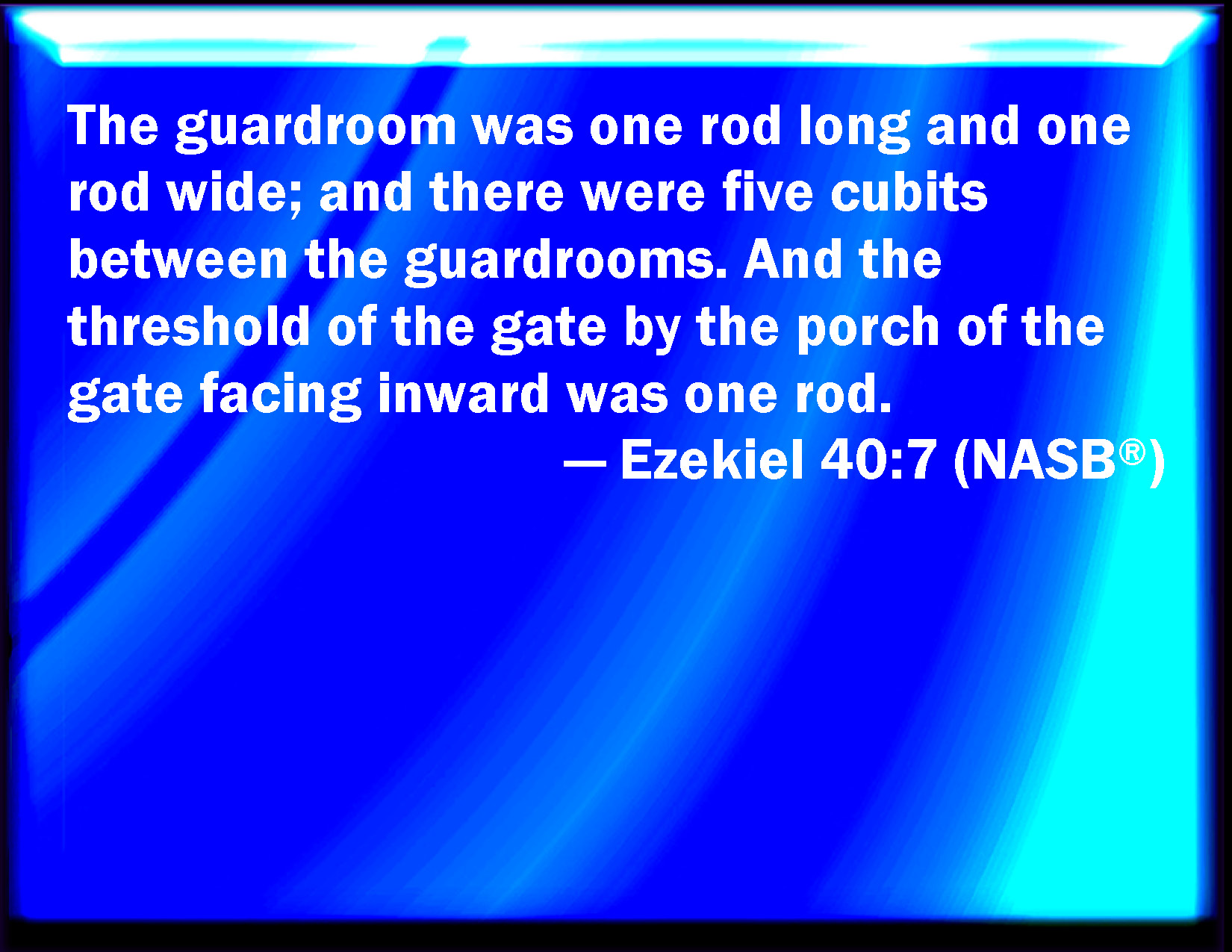 Bible Verse Slide Ezekiel 40:7 And every little chamber was one reed long, and one reed broad; and between the little chambers were five cubits; and the threshold of the gate by the porch of the gate within was one reed. KJV: And every little chamber was one reed long, and one reed broad; and between the little chambers were five cubits; and the threshold of the gate by the porch of the gate within was one reed. DRB: And every little chamber was one reed long, and one reed broad: and between the little chambers were five cubits: DBT: And each chamber was one reed long and one reed broad; and between the chambers were five cubits; and the threshold of the gate, beside the porch of the gate within, was one reed. ERV: And every lodge was one reed long, and one reed broad; and the space between the lodges was five cubits; and the threshold of the gate by the porch of the gate toward the house was one reed. WBT: And every little chamber was one reed long, and one reed broad; and between the little chambers were five cubits; and the threshhold of the gate by the porch of the gate within was one reed. WEB: Every lodge was one reed long, and one reed broad; and [the space] between the lodges was five cubits; and the threshold of the gate by the porch of the gate toward the house was one reed. YLT: and the little chamber one reed long and one reed broad, and between the little chambers five cubits, and the threshold of the gate, from the side of the porch of the gate from within, one reed.Links Ezekiel 40:7 NIV • Ezekiel 40:7 NLT • Ezekiel 40:7 ESV • Ezekiel 40:7 NASB • Ezekiel 40:7 KJV • Ezekiel 40:7 Interlinear • Ezekiel 40:7 Commentaries • Ezekiel 40:7 Parallel Texts • Ezekiel 40:7 Bible Apps • Ezekiel 40:7 Parallel • Bible Hub |