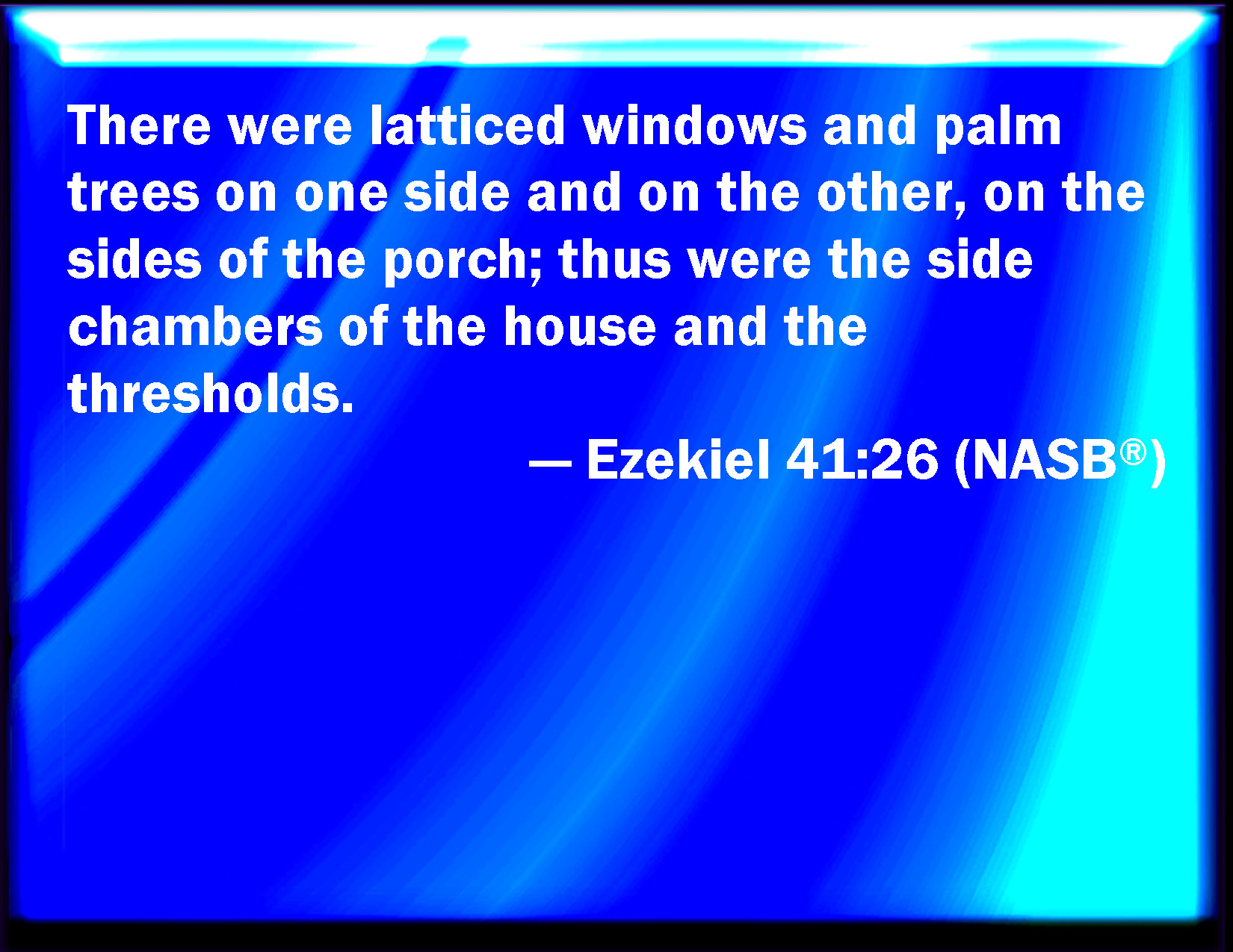 Bible Verse Slide Ezekiel 41:26 And there were narrow windows and palm trees on the one side and on the other side, on the sides of the porch, and on the side chambers of the house, and thick planks. KJV: And there were narrow windows and palm trees on the one side and on the other side, on the sides of the porch, and upon the side chambers of the house, and thick planks. DRB: Upon which were the oblique windows, and the representation of palm trees on this side, and on that side in the sides of the porch, according to the sides of the house, and the breadth of the walls. DBT: and closed windows and palm-trees on the one side and on the other side, on the sides of the porch and the side chambers of the house and the portals. ERV: And there were closed windows and palm trees on the one side and on the other side, on the sides of the porch: thus were the side-chambers of the house, and the thick beams. WBT: And there were narrow windows and palm-trees on the one side and on the other side, on the sides of the porch, and upon the side-chambers of the house, and thick planks. WEB: There were closed windows and palm trees on the one side and on the other side, on the sides of the porch: thus were the side rooms of the house, and the thresholds. YLT: And narrow windows and palm-trees are on this side, and on that side, at the sides of the porch, and the side-chambers of the house, and the thick places.Links Ezekiel 41:26 NIV • Ezekiel 41:26 NLT • Ezekiel 41:26 ESV • Ezekiel 41:26 NASB • Ezekiel 41:26 KJV • Ezekiel 41:26 Interlinear • Ezekiel 41:26 Commentaries • Ezekiel 41:26 Parallel Texts • Ezekiel 41:26 Bible Apps • Ezekiel 41:26 Parallel • Bible Hub |