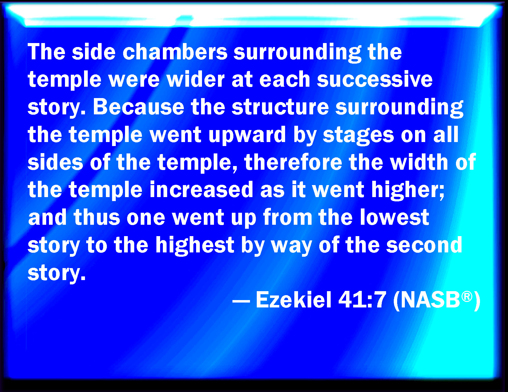 Ezekiel 41:7 And there was an enlarging, and a winding about still upward to the side chambers: for the winding about of the house went still upward round about the house: therefore the breadth of the house was still upward, and so increased from the lowest chamber to the highest by the middle.