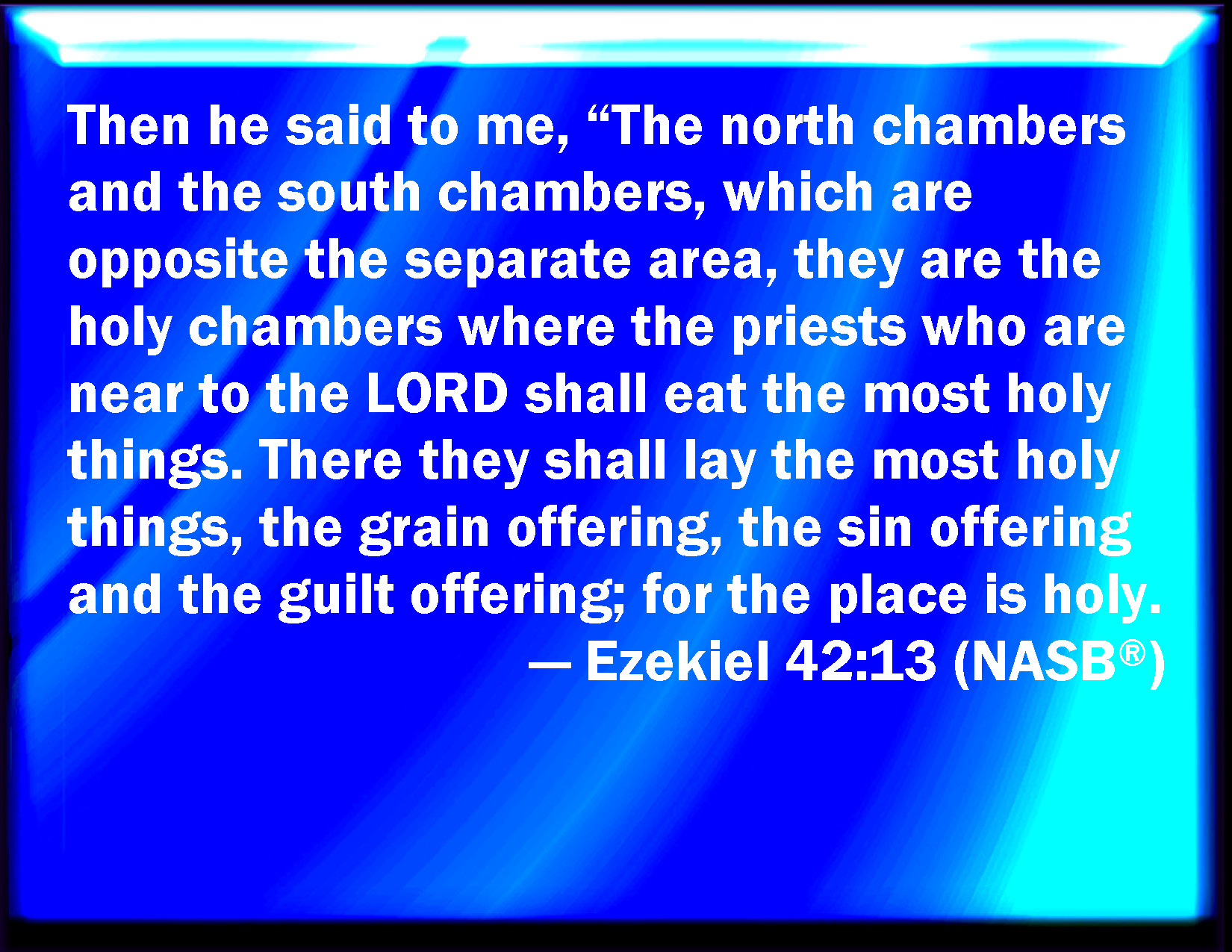 Bible Verse Slide Ezekiel 42:13 Then said he to me, The north chambers and the south chambers, which are before the separate place, they be holy chambers, where the priests that approach to the LORD shall eat the most holy things: there shall they lay the most holy things, and the meat offering, and the sin offering, and the trespass offering; for the place is holy. KJV: Then said he unto me, The north chambers and the south chambers, which are before the separate place, they be holy chambers, where the priests that approach unto the LORD shall eat the most holy things: there shall they lay the most holy things, and the meat offering, and the sin offering, and the trespass offering; for the place is holy. DRB: And he said to me: The chambers of the north, and the chambers of the south, which are before the separate building: they are holy chambers, in which the priests shall eat, that approach to the Lord into the holy of holies: there they shall lay the most holy things, and the offering for sin, and for trespass: for it is a holy place. DBT: And he said unto me, The north cells and the south cells, which are before the separate place, they are holy cells, where the priests that come near unto Jehovah shall eat the most holy things; there shall they lay the most holy things, both the oblation and the sin-offering and the trespass-offering: for the place is holy. ERV: Then said he unto me, The north chambers and the south chambers, which are before the separate place, they be the holy chambers, where the priests that are near unto the LORD shall eat the most holy things: there shall they lay the most holy things, and the meal offering, and the sin offering, and the guilt offering; for the place is holy. WBT: Then said he to me, The north chambers and the south chambers which are before the separate place, they are holy chambers, where the priests that approach to the LORD shall eat the most holy things: there shall they lay the most holy things, and the meat-offering, and the sin-offering, and the trespass-offering; for the place is holy. WEB: Then he said to me, The north rooms and the south rooms, which are before the separate place, they are the holy rooms, where the priests who are near to Yahweh shall eat the most holy things: there shall they lay the most holy things, and the meal offering, and the sin offering, and the trespass offering; for the place is holy. YLT: And he saith unto me, 'The north chambers, the south chambers, that are at the front of the separate place, they are holy chambers, where the priests (who are near to Jehovah) eat the most holy things, there they place the most holy things, and the present, and the sin-offering, and the guilt-offering, for the place is holy.Links Ezekiel 42:13 NIV • Ezekiel 42:13 NLT • Ezekiel 42:13 ESV • Ezekiel 42:13 NASB • Ezekiel 42:13 KJV • Ezekiel 42:13 Interlinear • Ezekiel 42:13 Commentaries • Ezekiel 42:13 Parallel Texts • Ezekiel 42:13 Bible Apps • Ezekiel 42:13 Parallel • Bible Hub |