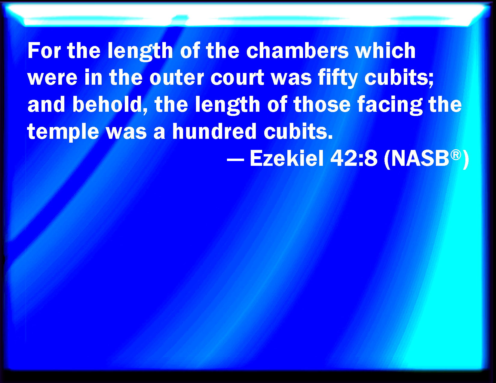 Bible Verse Slide Ezekiel 42:8 For the length of the chambers that were in the utter court was fifty cubits: and, see, before the temple were an hundred cubits. KJV: For the length of the chambers that were in the utter court was fifty cubits: and, lo, before the temple were an hundred cubits. DRB: For the length of the chambers of the outward court was fifty cubits: and the length before the face of the temple, a hundred cubits. DBT: for the length of the cells that were against the outer court was fifty cubits; but behold, before the temple it was a hundred cubits. ERV: For the length of the chambers that were in the outer court was fifty cubits: and, lo, before the temple were an hundred cubits. WBT: For the length of the chambers that were in the outer court was fifty cubits: and lo, before the temple were a hundred cubits. WEB: For the length of the rooms that were in the outer court was fifty cubits: and behold, before the temple were one hundred cubits. YLT: for the length of the chambers that are to the outer court is fifty cubits, and of those on the front of the temple a hundred cubits.Links Ezekiel 42:8 NIV • Ezekiel 42:8 NLT • Ezekiel 42:8 ESV • Ezekiel 42:8 NASB • Ezekiel 42:8 KJV • Ezekiel 42:8 Interlinear • Ezekiel 42:8 Commentaries • Ezekiel 42:8 Parallel Texts • Ezekiel 42:8 Bible Apps • Ezekiel 42:8 Parallel • Bible Hub |