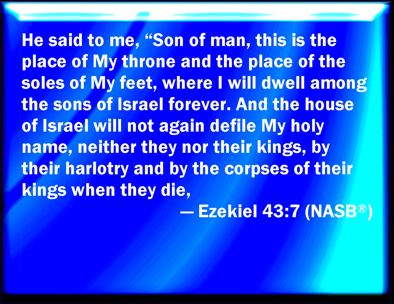 Bible Verse Slide Ezekiel 43:7 And he said to me, Son of man, the place of my throne, and the place of the soles of my feet, where I will dwell in the middle of the children of Israel for ever, and my holy name, shall the house of Israel no more defile, neither they, nor their kings, by their prostitution, nor by the carcasses of their kings in their high places. KJV: And he said unto me, Son of man, the place of my throne, and the place of the soles of my feet, where I will dwell in the midst of the children of Israel for ever, and my holy name, shall the house of Israel no more defile, neither they, nor their kings, by their whoredom, nor by the carcases of their kings in their high places. DRB: Said to me: Son of man, the place of my throne, and the place of the soles of my feet, where I dwell in the midst of the children of Israel for ever: and the house of Israel shall no more profane my holy name, they and their kings by their fornications, and by the carcasses of their kings, and by the high places. DBT: And he said unto me, Son of man, this is the place of my throne, and the place of the soles of my feet, where I will dwell in the midst of the children of Israel for ever; and the house of Israel shall no more defile my holy name, they nor their kings, with their fornication, and with the carcases of their kings in their high places, ERV: And he said unto me, Son of man, this is the place of my throne, and the place of the soles of my feet, where I will dwell in the midst of the children of Israel for ever: and the house of Israel shall no more defile my holy name, neither they, nor their kings, by their whoredom, and by the carcases of their kings in their high places; WBT: And he said to me, Son of man, the place of my throne, and the place of the soles of my feet, where I will dwell in the midst of the children of Israel for ever, and my holy name, shall the house of Israel no more defile, neither they, nor their kings, by their lewd deeds, nor by the carcasses of their kings in their high places. WEB: He said to me, Son of man, [this is] the place of my throne, and the place of the soles of my feet, where I will dwell in the midst of the children of Israel forever. The house of Israel shall no more defile my holy name, neither they, nor their kings, by their prostitution, and by the dead bodies of their kings [in] their high places; YLT: and He saith unto me: 'Son of man, the place of My throne, And the place of the soles of My feet, Where I dwell in the midst of the sons of Israel to the age, Defile no more do the house of Israel My holy name, They, and their kings, by their whoredom, And by the carcases of their kings — their high places.Links Ezekiel 43:7 NIV • Ezekiel 43:7 NLT • Ezekiel 43:7 ESV • Ezekiel 43:7 NASB • Ezekiel 43:7 KJV • Ezekiel 43:7 Interlinear • Ezekiel 43:7 Commentaries • Ezekiel 43:7 Parallel Texts • Ezekiel 43:7 Bible Apps • Ezekiel 43:7 Parallel • Bible Hub |
