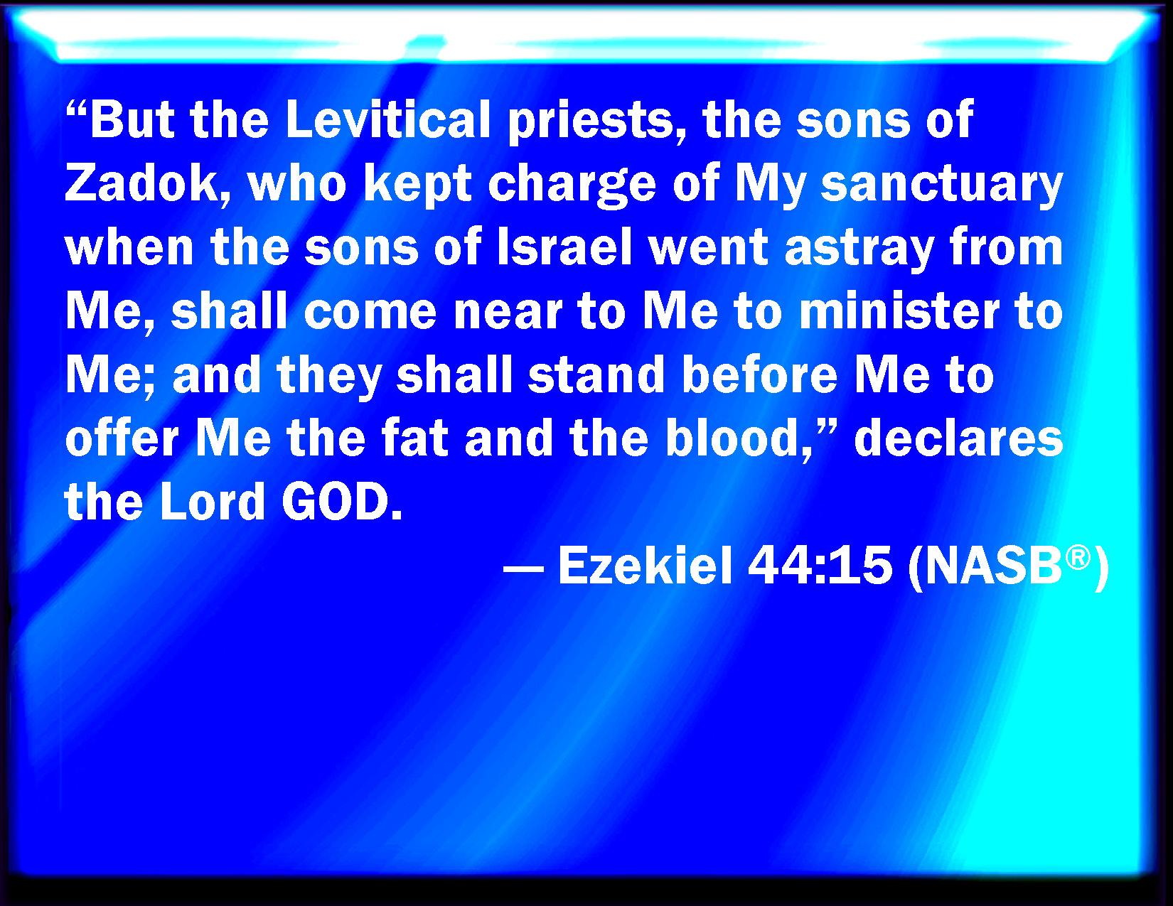 Bible Verse Slide Ezekiel 44:15 But the priests the Levites, the sons of Zadok, that kept the charge of my sanctuary when the children of Israel went astray from me, they shall come near to me to minister to me, and they shall stand before me to offer to me the fat and the blood, said the Lord GOD: KJV: But the priests the Levites, the sons of Zadok, that kept the charge of my sanctuary when the children of Israel went astray from me, they shall come near to me to minister unto me, and they shall stand before me to offer unto me the fat and the blood, saith the Lord GOD: DRB: But the priests, and Levites, the sons of Sadoc, who kept the ceremonies or my sanctuary, when the children of Israel went astray from me, they shall come near to me, to minister to me: and they shall stand before me, to offer me the fat, and the blood, saith the Lord God. DBT: But the priests, the Levites, the sons of Zadok, that kept the charge of my sanctuary when the children of Israel went astray from me, they shall approach unto me to minister unto me, and they shall stand before me to present unto me the fat and the blood, saith the Lord Jehovah. ERV: But the priests the Levites, the sons of Zadok, that kept the charge of my sanctuary when the children of Israel went astray from me, they shall come near to me to minister unto me; and they shall stand before me to offer unto me the fat and the blood, saith the Lord GOD: WBT: But the priests the Levites, the sons of Zadok, that kept the charge of my sanctuary when the children of Israel went astray from me, they shall come near to me to minister to me, and they shall stand before me to offer to me the fat and the blood, saith the Lord GOD: WEB: But the priests the Levites, the sons of Zadok, who performed the duty of my sanctuary when the children of Israel went astray from me, they shall come near to me to minister to me; and they shall stand before me to offer to me the fat and the blood, says the Lord Yahweh: YLT: And the priests, the Levites, sons of Zadok, who have kept the charge of My sanctuary in the wandering of the sons of Israel from off Me, they draw near unto Me to serve Me, and have stood before Me, to bring near to Me fat and blood — an affirmation of the Lord Jehovah:Links Ezekiel 44:15 NIV • Ezekiel 44:15 NLT • Ezekiel 44:15 ESV • Ezekiel 44:15 NASB • Ezekiel 44:15 KJV • Ezekiel 44:15 Interlinear • Ezekiel 44:15 Commentaries • Ezekiel 44:15 Parallel Texts • Ezekiel 44:15 Bible Apps • Ezekiel 44:15 Parallel • Bible Hub |