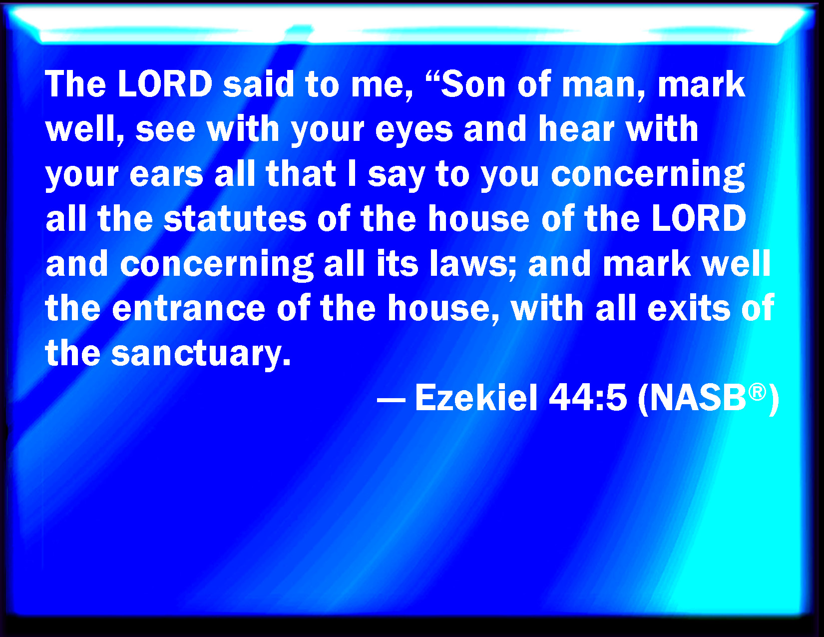 Bible Verse Slide Ezekiel 44:5 And the LORD said to me, Son of man, mark well, and behold with your eyes, and hear with your ears all that I say to you concerning all the ordinances of the house of the LORD, and all the laws thereof; and mark well the entering in of the house, with every going forth of the sanctuary. KJV: And the LORD said unto me, Son of man, mark well, and behold with thine eyes, and hear with thine ears all that I say unto thee concerning all the ordinances of the house of the LORD, and all the laws thereof; and mark well the entering in of the house, with every going forth of the sanctuary. DRB: And the Lord said to me: Son of man, attend with thy heart, and behold with thy eyes, and hear with thy ears, all that I say to thee concerning all the ceremonies of the house of the Lord, and concerning all the laws thereof: and mark well the ways of the temple, with all the goings out of the sanctuary. DBT: And Jehovah said unto me, Son of man, apply thy heart, and behold with thine eyes, and hear with thine ears all that I say unto thee concerning all the statutes of the house of Jehovah, and all the laws thereof; and mark well the entering in of the house, with every going forth of the sanctuary; ERV: And the LORD said unto me, Son of man, mark well, and behold with thine eyes, and hear with thine ears all that I say unto thee concerning all the ordinances of the house of the LORD, and all the laws thereof; and mark well the entering in of the house, with every going forth of the sanctuary. WBT: And the LORD said to me, Son of man mark well, and behold with thy eyes, and hear with thy ears all that I say to thee concerning all the ordinances of the house of the LORD, and all its laws; and mark well the entrance of the house, with every going forth of the sanctuary; WEB: Yahweh said to me, Son of man, mark well, and see with your eyes, and hear with your ears all that I tell you concerning all the ordinances of the house of Yahweh, and all its laws; and mark well the entrance of the house, with every exit of the sanctuary. YLT: And Jehovah saith unto me, 'Son of man, set thy heart, and see with thine eyes, and with thine ears hear, all that I am speaking with thee, of all the statutes of the house of Jehovah, and of all its laws; and thou hast set thy heart to the entrance of the house, with all the outlets of the sanctuary,Links Ezekiel 44:5 NIV • Ezekiel 44:5 NLT • Ezekiel 44:5 ESV • Ezekiel 44:5 NASB • Ezekiel 44:5 KJV • Ezekiel 44:5 Interlinear • Ezekiel 44:5 Commentaries • Ezekiel 44:5 Parallel Texts • Ezekiel 44:5 Bible Apps • Ezekiel 44:5 Parallel • Bible Hub |