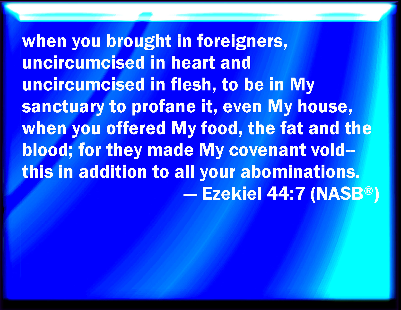 Bible Verse Slide Ezekiel 44:7 In that you have brought into my sanctuary strangers, uncircumcised in heart, and uncircumcised in flesh, to be in my sanctuary, to pollute it, even my house, when you offer my bread, the fat and the blood, and they have broken my covenant because of all your abominations. KJV: In that ye have brought into my sanctuary strangers, uncircumcised in heart, and uncircumcised in flesh, to be in my sanctuary, to pollute it, even my house, when ye offer my bread, the fat and the blood, and they have broken my covenant because of all your abominations. DRB: In that you have brought in strangers uncircumcised in heart, and uncircumcised in flesh, to be in my sanctuary, and to defile my house: and you offer my bread, the fat, and the blood: and you have broken my covenant by all your wicked doings. DBT: in that ye have brought strangers, uncircumcised in heart and uncircumcised in flesh, to be in my sanctuary, to profane it, even my house, when ye offered my bread, the fat and the blood; and they have broken my covenant besides all your abominations. ERV: in that ye have brought in aliens, uncircumcised in heart and uncircumcised in flesh, to be in my sanctuary, to profane it, even my house, when ye offer my bread, the fat and the blood, and they have broken my covenant, to add unto all your abominations. WBT: In that ye have brought into my sanctuary strangers, uncircumcised in heart, and uncircumcised in flesh, to be in my sanctuary, to pollute it, even my house, when ye offer my bread, the fat and the blood, and they have broken my covenant because of all your abominations. WEB: in that you have brought in foreigners, uncircumcised in heart and uncircumcised in flesh, to be in my sanctuary, to profane it, even my house, when you offer my bread, the fat and the blood, and they have broken my covenant, [to add] to all your abominations. YLT: In your bringing in sons of a stranger, uncircumcised of heart, and uncircumcised of flesh, to be in My sanctuary, to pollute it, even My house, in your bringing near My bread, fat, and blood, and they break My covenant by all your abominations,Links Ezekiel 44:7 NIV • Ezekiel 44:7 NLT • Ezekiel 44:7 ESV • Ezekiel 44:7 NASB • Ezekiel 44:7 KJV • Ezekiel 44:7 Interlinear • Ezekiel 44:7 Commentaries • Ezekiel 44:7 Parallel Texts • Ezekiel 44:7 Bible Apps • Ezekiel 44:7 Parallel • Bible Hub |