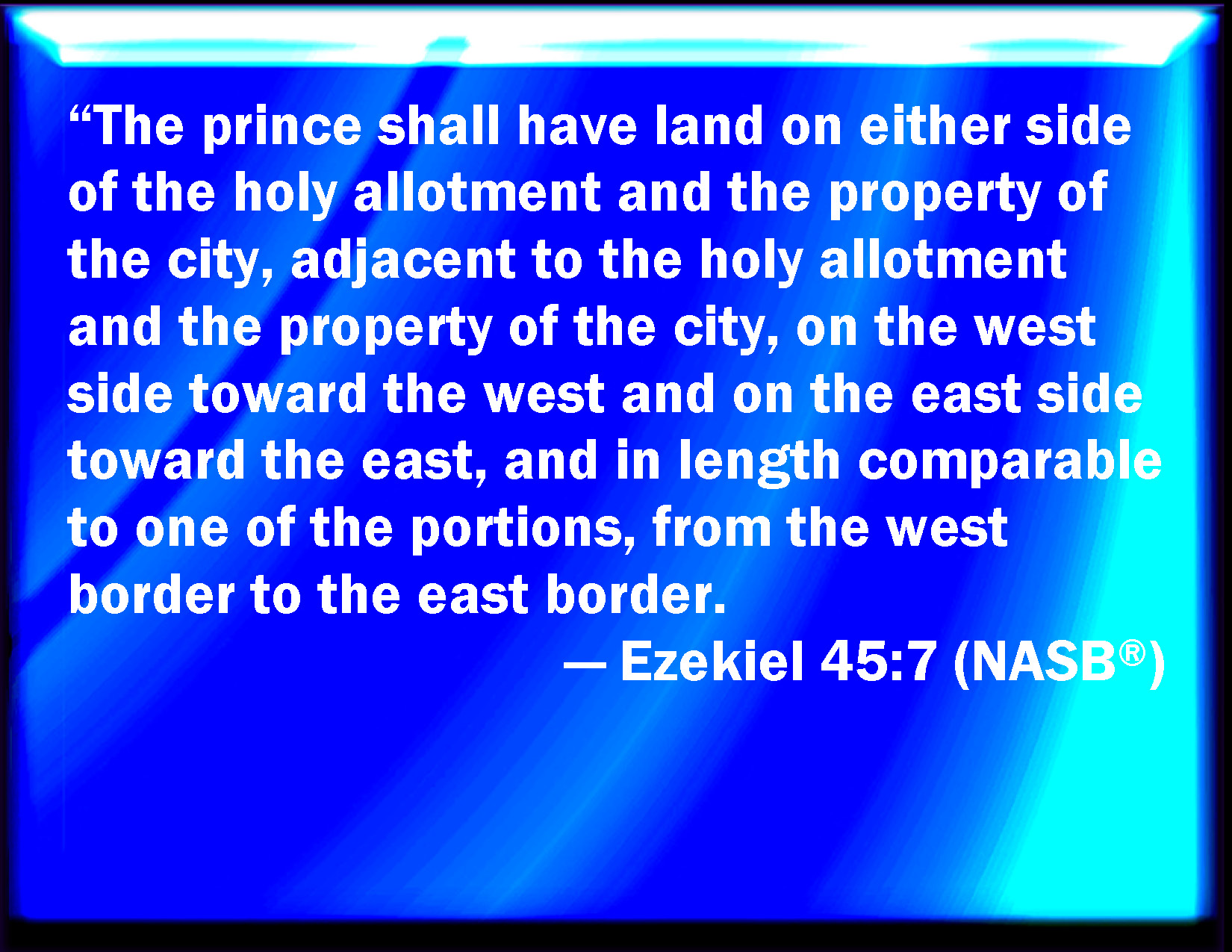 Ezekiel 45:7 And a portion shall be for the prince on the one side and on the other side of the oblation of the holy portion, and of the possession of the city, before the oblation of the holy portion, and before the possession of the city, from the west side westward, and from the east side eastward: and the length shall be over against one of the portions, from the west border to the east border.