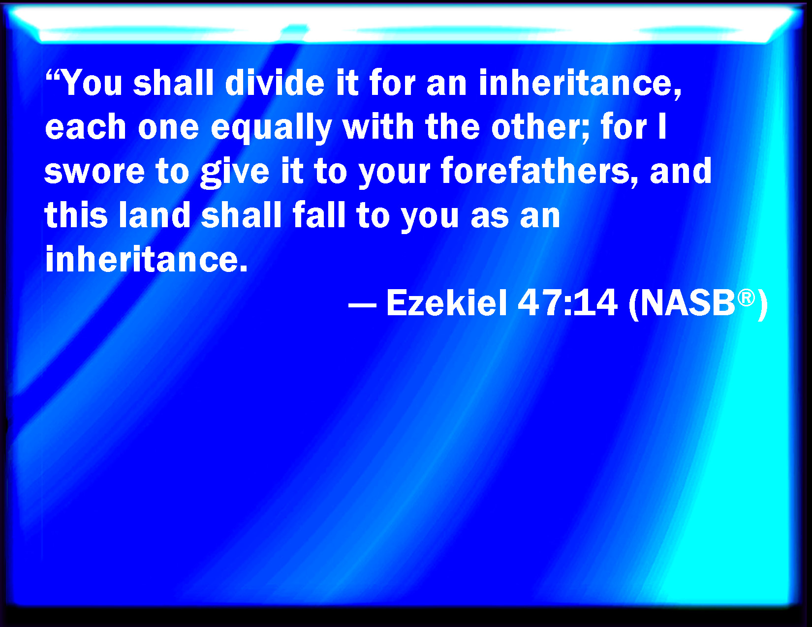 Bible Verse Slide Ezekiel 47:14 And you shall inherit it, one as well as another: concerning the which I lifted up my hand to give it to your fathers: and this land shall fall to you for inheritance. KJV: And ye shall inherit it, one as well as another: concerning the which I lifted up mine hand to give it unto your fathers: and this land shall fall unto you for inheritance. DRB: And you shall possess it, every man in like manner as his brother: concerning which I lifted up my hand to give it to your fathers: and this land shall fall unto you for a possession. DBT: And ye shall inherit it, one as well as another, the land concerning which I lifted up my hand to give it unto your fathers; and this land shall fall to you for inheritance. ERV: And ye shall inherit it, one as well as another; concerning the which I lifted up mine hand to give it unto your fathers: and this land shall fall unto you for inheritance. WBT: And ye shall inherit it, one as well as another: concerning which I lifted up my hand to give it to your fathers: and this land shall fall to you for inheritance. WEB: You shall inherit it, one as well as another; for I swore to give it to your fathers: and this land shall fall to you for inheritance. YLT: And ye have inherited it, one as well as another, in that I have lifted up My hand to give it to your fathers; and this land hath fallen to you in inheritance.Links Ezekiel 47:14 NIV • Ezekiel 47:14 NLT • Ezekiel 47:14 ESV • Ezekiel 47:14 NASB • Ezekiel 47:14 KJV • Ezekiel 47:14 Interlinear • Ezekiel 47:14 Commentaries • Ezekiel 47:14 Parallel Texts • Ezekiel 47:14 Bible Apps • Ezekiel 47:14 Parallel • Bible Hub |
