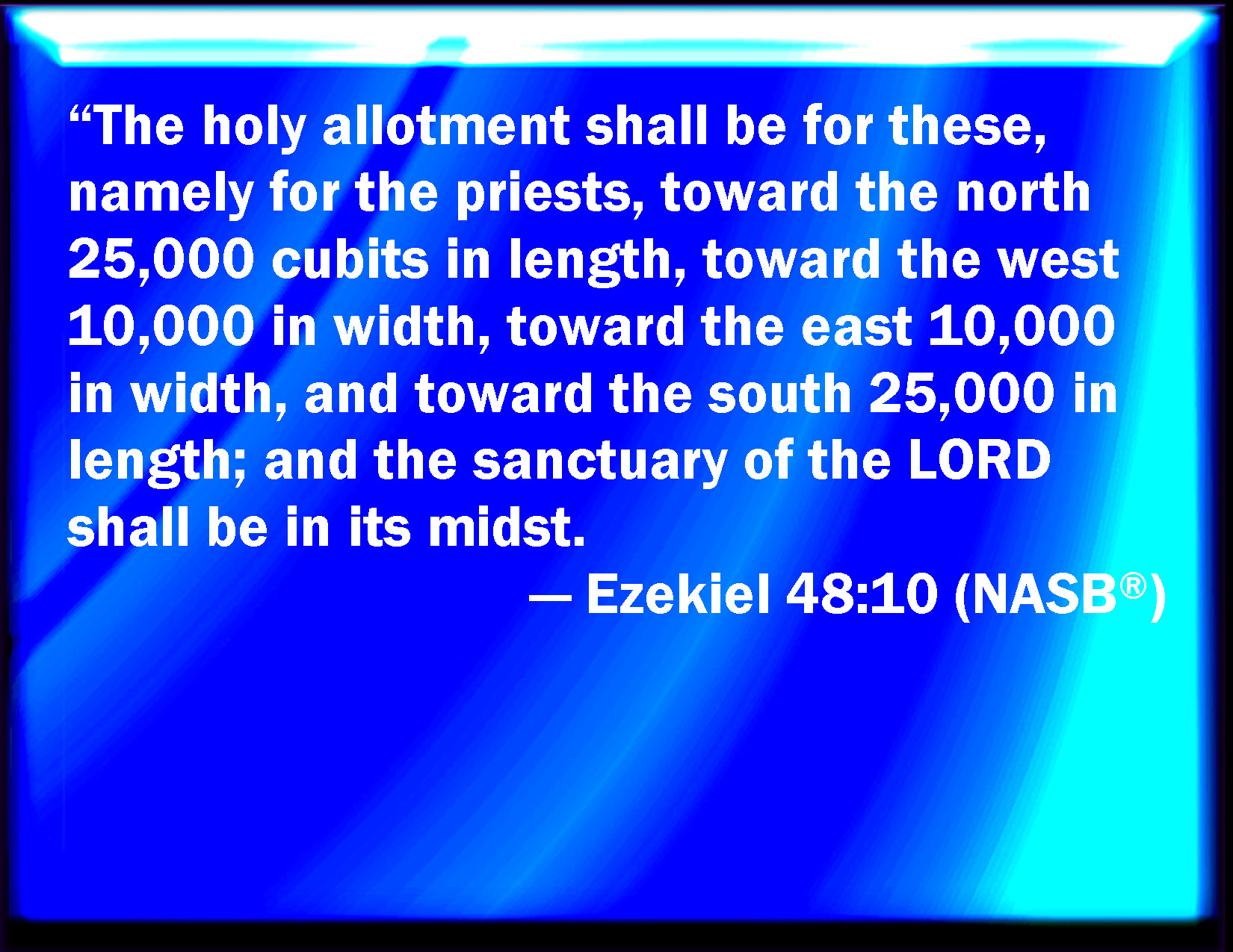 Bible Verse Slide Ezekiel 48:10 And for them, even for the priests, shall be this holy oblation; toward the north five and twenty thousand in length, and toward the west ten thousand in breadth, and toward the east ten thousand in breadth, and toward the south five and twenty thousand in length: and the sanctuary of the LORD shall be in the middle thereof. KJV: And for them, even for the priests, shall be this holy oblation; toward the north five and twenty thousand in length, and toward the west ten thousand in breadth, and toward the east ten thousand in breadth, and toward the south five and twenty thousand in length: and the sanctuary of the LORD shall be in the midst thereof. DRB: And these shall be the firstfruits of the sanctuary for the priests: toward the north five and twenty thousand in length, and toward the sea ten thousand in breadth, and toward the east also ten thousand in breadth, and toward the south five and twenty thousand in length: and the sanctuary of the Lord shall be in the midst thereof. DBT: And for them, for the priests, shall be the holy heave-offering, toward the north five and twenty thousand, and toward the west the breadth ten thousand, and toward the east the breadth ten thousand, and toward the south the length five and twenty thousand: and the sanctuary of Jehovah shall be in the midst of it. ERV: And for these, even for the priests, shall be the holy oblation; toward the north five and twenty thousand in length, and toward the west ten thousand in breadth, and toward the east ten thousand in breadth, and toward the south five and twenty thousand in length: and the sanctuary of the LORD shall be in the midst thereof. WBT: And for them, even for the priests, shall be this holy oblation; towards the north five and twenty thousand in length, and towards the west ten thousand in breadth, and towards the east ten thousand in breadth, and towards the south five and twenty thousand in length: and the sanctuary of the LORD shall be in the midst of it. WEB: For these, even for the priests, shall be the holy offering: toward the north twenty-five thousand [in length], and toward the west ten thousand in breadth, and toward the east ten thousand in breadth, and toward the south twenty-five thousand in length: and the sanctuary of Yahweh shall be in its midst. YLT: And of these is the holy heave-offering for the priests, northward five and twenty thousand, and westward in breadth ten thousand, and eastward in breadth ten thousand, and southward in length five and twenty thousand: and the sanctuary of Jehovah hath been in its midst.Links Ezekiel 48:10 NIV • Ezekiel 48:10 NLT • Ezekiel 48:10 ESV • Ezekiel 48:10 NASB • Ezekiel 48:10 KJV • Ezekiel 48:10 Interlinear • Ezekiel 48:10 Commentaries • Ezekiel 48:10 Parallel Texts • Ezekiel 48:10 Bible Apps • Ezekiel 48:10 Parallel • Bible Hub |