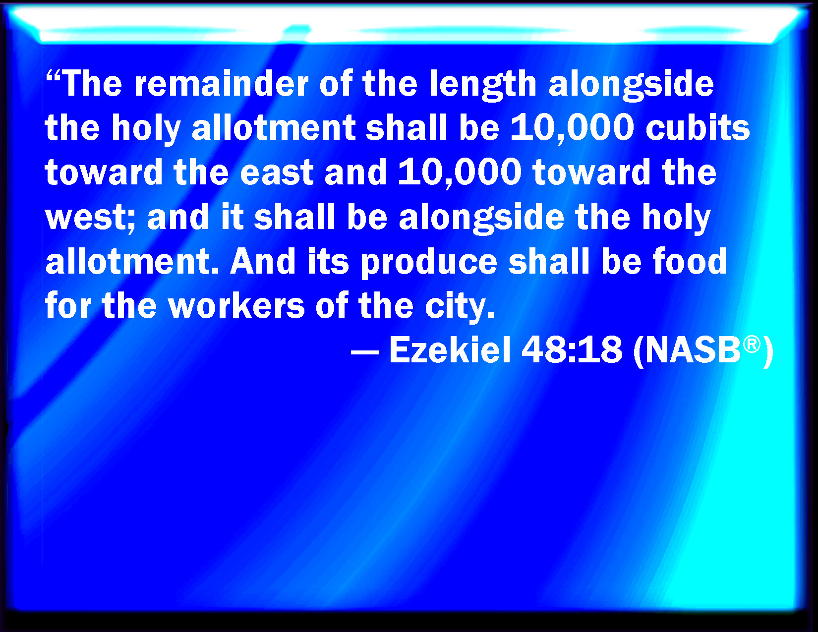 Ezekiel 48:18 And the residue in length over against the oblation of the holy portion shall be ten thousand eastward, and ten thousand westward: and it shall be over against the oblation of the holy portion; and the increase thereof shall be for food to them that serve the city.