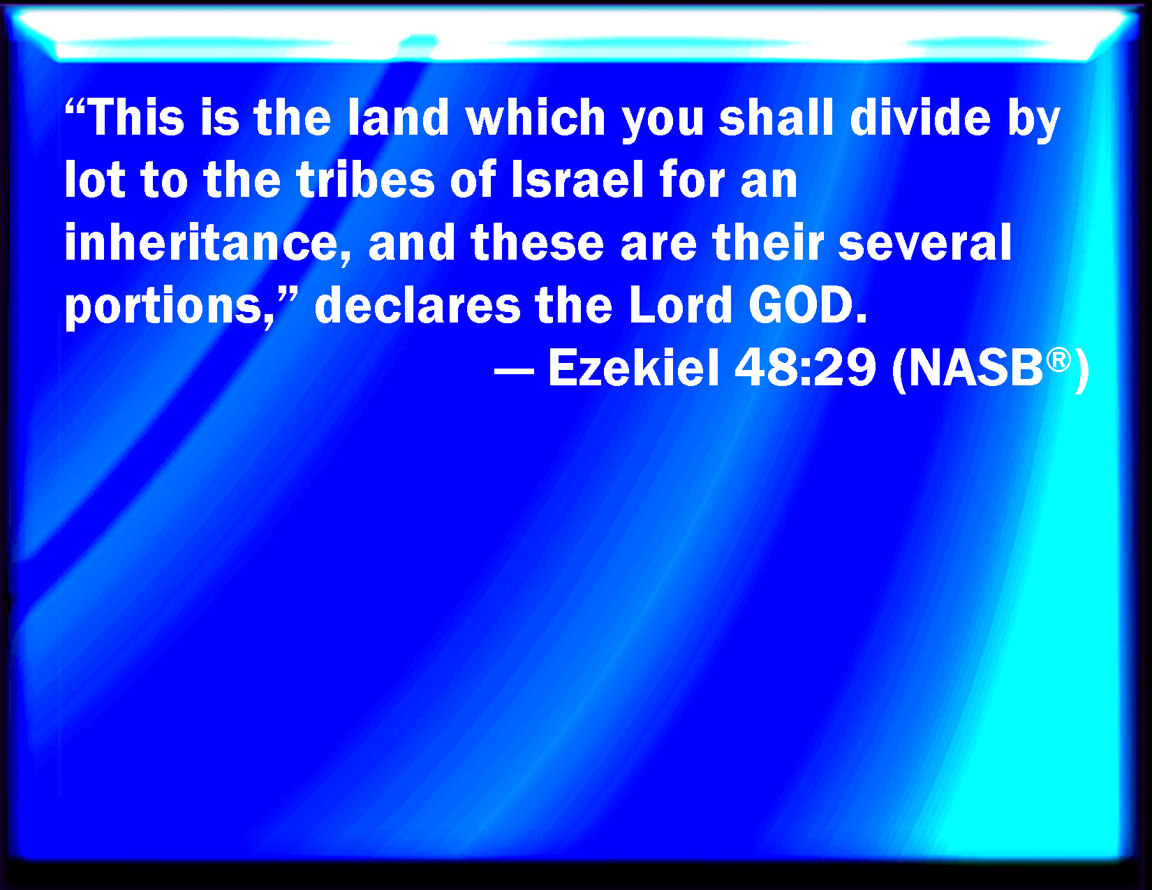 Bible Verse Slide Ezekiel 48:29 This is the land which you shall divide by lot to the tribes of Israel for inheritance, and these are their portions, said the Lord GOD. KJV: This is the land which ye shall divide by lot unto the tribes of Israel for inheritance, and these are their portions, saith the Lord GOD. DRB: This is the land which you shall divide by lot to the tribes of Israel: and these are the portions of them, saith the Lord God. DBT: This is the land which ye shall divide by lot unto the tribes of Israel for inheritance, and these are their portions, saith the Lord Jehovah. ERV: This is the land which ye shall divide by lot unto the tribes of Israel for inheritance, and these are their several portions, saith the Lord GOD. WBT: This is the land which ye shall divide by lot to the tribes of Israel for inheritance, and these are their portions, saith the Lord GOD. WEB: This is the land which you shall divide by lot to the tribes of Israel for inheritance, and these are their several portions, says the Lord Yahweh. YLT: This is the land that ye separate by inheritance to the tribes of Israel, and these are their portions — an affirmation of the Lord Jehovah.Links Ezekiel 48:29 NIV • Ezekiel 48:29 NLT • Ezekiel 48:29 ESV • Ezekiel 48:29 NASB • Ezekiel 48:29 KJV • Ezekiel 48:29 Interlinear • Ezekiel 48:29 Commentaries • Ezekiel 48:29 Parallel Texts • Ezekiel 48:29 Bible Apps • Ezekiel 48:29 Parallel • Bible Hub |