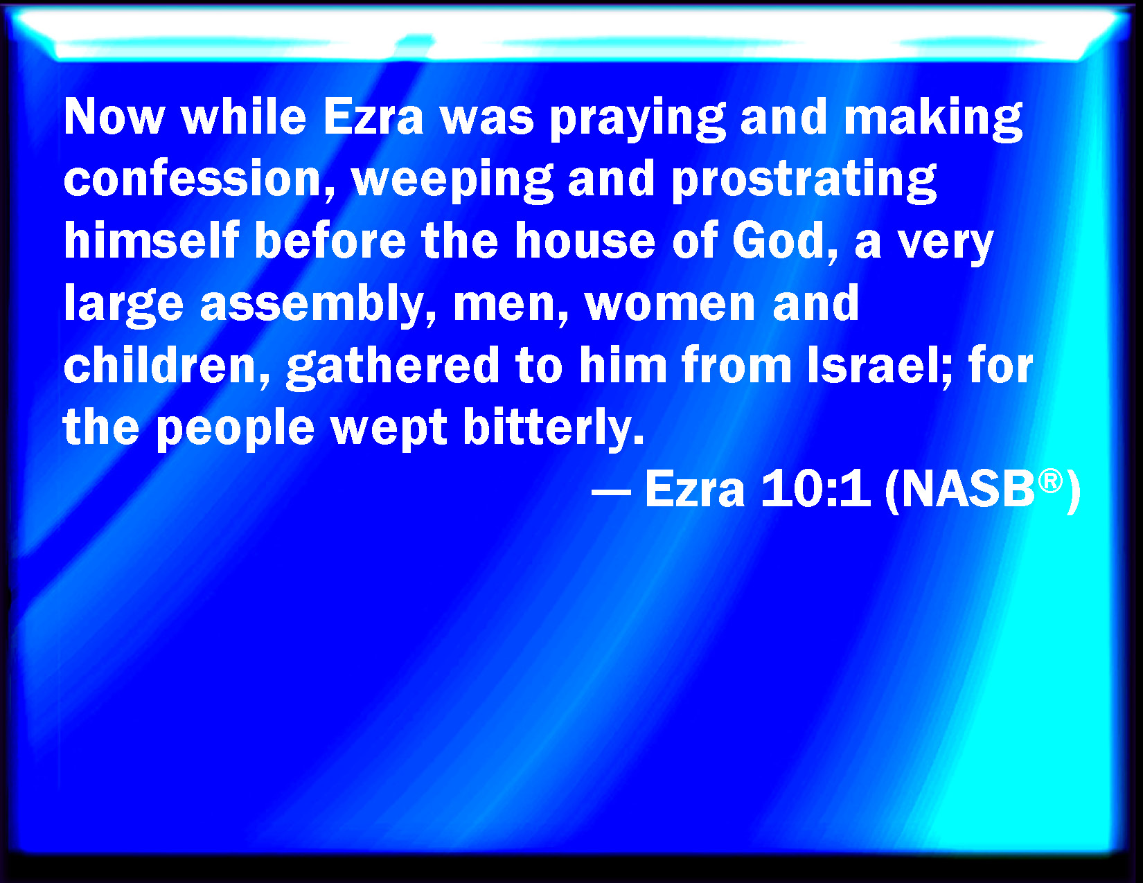 Bible Verse Slide Ezra 10:1 Now when Ezra had prayed, and when he had confessed, weeping and casting himself down before the house of God, there assembled to him out of Israel a very great congregation of men and women and children: for the people wept very sore. KJV: Now when Ezra had prayed, and when he had confessed, weeping and casting himself down before the house of God, there assembled unto him out of Israel a very great congregation of men and women and children: for the people wept very sore. DRB: Now when Esdras was thus praying, and beseeching, and weeping, and lying before the temple of God, there was gathered to him of Israel an exceeding great assembly of men and women and children, and the people wept with much lamentation. DBT: And while Ezra prayed, and made confession, weeping and falling down before the house of God, there were gathered to him out of Israel a very great congregation of men and women and children; for the people wept very much. ERV: Now while Ezra prayed, and made confession, weeping and casting himself down before the house of God, there was gathered together unto him out of Israel a very great congregation of men and women and children: for the people wept very sore. WBT: Now when Ezra had prayed, and when he had confessed, weeping and casting himself down before the house of God, there assembled to him out of Israel a very great congregation of men and women and children: for the people wept very bitterly. WEB: Now while Ezra prayed and made confession, weeping and casting himself down before the house of God, there was gathered together to him out of Israel a very great assembly of men and women and children; for the people wept very bitterly. YLT: And at Ezra's praying, and at his making confession, weeping and casting himself down before the house of God, there have been gathered unto him out of Israel an assembly very great — men and women and children — for the people have wept, multiplying weeping.Links Ezra 10:1 NIV • Ezra 10:1 NLT • Ezra 10:1 ESV • Ezra 10:1 NASB • Ezra 10:1 KJV • Ezra 10:1 Interlinear • Ezra 10:1 Commentaries • Ezra 10:1 Parallel Texts • Ezra 10:1 Bible Apps • Ezra 10:1 Parallel • Bible Hub |