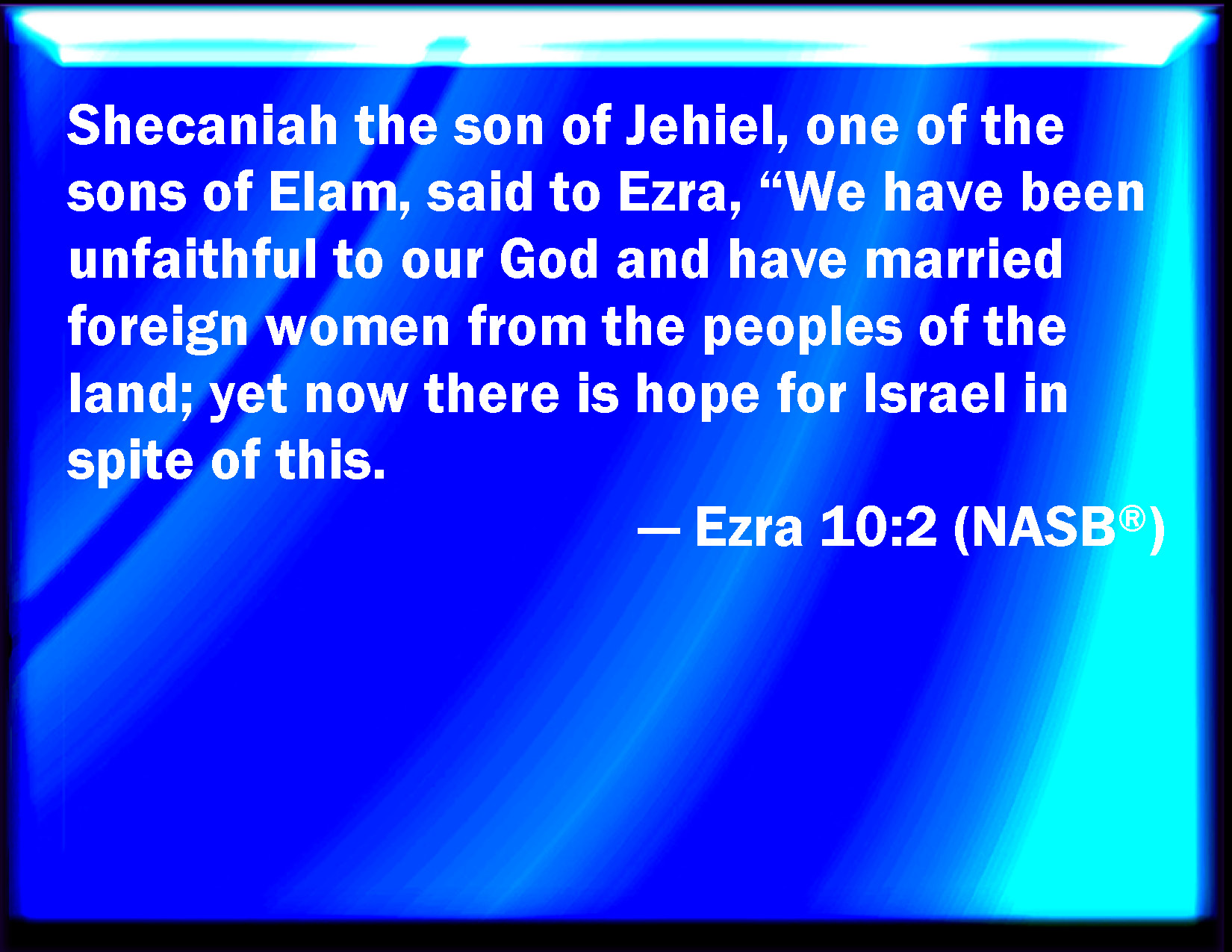 Bible Verse Slide Ezra 10:2 And Shechaniah the son of Jehiel, one of the sons of Elam, answered and said to Ezra, We have trespassed against our God, and have taken strange wives of the people of the land: yet now there is hope in Israel concerning this thing. KJV: And Shechaniah the son of Jehiel, one of the sons of Elam, answered and said unto Ezra, We have trespassed against our God, and have taken strange wives of the people of the land: yet now there is hope in Israel concerning this thing. DRB: And Sechenias the son of Jehiel of the sons of Elam answered, and said to Esdras: We have sinned against our God, and have taken strange wives of the people of the land: and now if there be repentance in Israel concerning this, DBT: And Shechaniah the son of Jehiel, of the sons of Elam, answered and said to Ezra, We have acted unfaithfully toward our God, and have taken foreign wives of the peoples of the land; yet now there is hope for Israel concerning this thing. ERV: And Shecaniah the son of Jehiel, one of the sons of Elam, answered and said unto Ezra, We have trespassed against our God, and have married strange women of the peoples of the land: yet now there is hope for Israel concerning this thing. WBT: And Shechaniah the son of Jehiel, one of the sons of Elam, answered and said to Ezra, We have trespassed against our God, and have taken foreign wives of the people of the land: yet now there is hope in Israel concerning this thing. WEB: Shecaniah the son of Jehiel, one of the sons of Elam, answered Ezra, "We have trespassed against our God, and have married foreign women of the peoples of the land. Yet now there is hope for Israel concerning this thing. YLT: And Shechaniah son of Jehiel, of the sons of Elam, answereth and saith to Ezra, 'We — we have trespassed against our God, and we settle strange women of the peoples of the land; and now there is hope for Israel concerning this,Links Ezra 10:2 NIV • Ezra 10:2 NLT • Ezra 10:2 ESV • Ezra 10:2 NASB • Ezra 10:2 KJV • Ezra 10:2 Interlinear • Ezra 10:2 Commentaries • Ezra 10:2 Parallel Texts • Ezra 10:2 Bible Apps • Ezra 10:2 Parallel • Bible Hub |