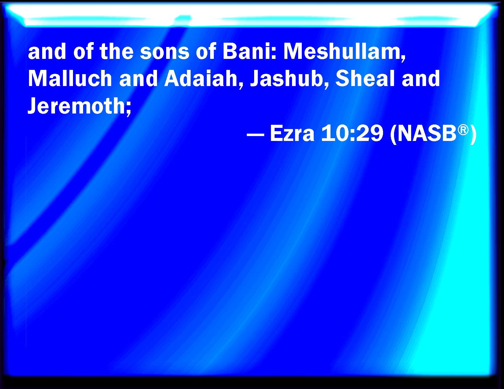 Bible Verse Slide Ezra 10:29 And of the sons of Bani; Meshullam, Malluch, and Adaiah, Jashub, and Sheal, and Ramoth. KJV: And of the sons of Bani; Meshullam, Malluch, and Adaiah, Jashub, and Sheal, and Ramoth. DRB: And of the sons of Bani, Mosollam, and Melluch, and Adaia, Jasub, and Seal, and Ramoth. DBT: And of the children of Bani: Meshullam, Malluch, and Adaiah, Jashub, and Sheal, and Ramoth. ERV: And of the sons of Bani; Meshullam, Malluch, and Adaiah, Jashub, and Sheal, Jeremoth. WBT: And of the sons of Bani; Meshullam, Malluch, and Adaiah, Jashub, and Sheal, and Ramoth. WEB: Of the sons of Bani: Meshullam, Malluch, and Adaiah, Jashub, and Sheal, Jeremoth. YLT: And of the sons of Bani: Meshullam, Malluch, and Adaiah, Jashub, and Sheal, and Ramoth.Links Ezra 10:29 NIV • Ezra 10:29 NLT • Ezra 10:29 ESV • Ezra 10:29 NASB • Ezra 10:29 KJV • Ezra 10:29 Interlinear • Ezra 10:29 Commentaries • Ezra 10:29 Parallel Texts • Ezra 10:29 Bible Apps • Ezra 10:29 Parallel • Bible Hub |