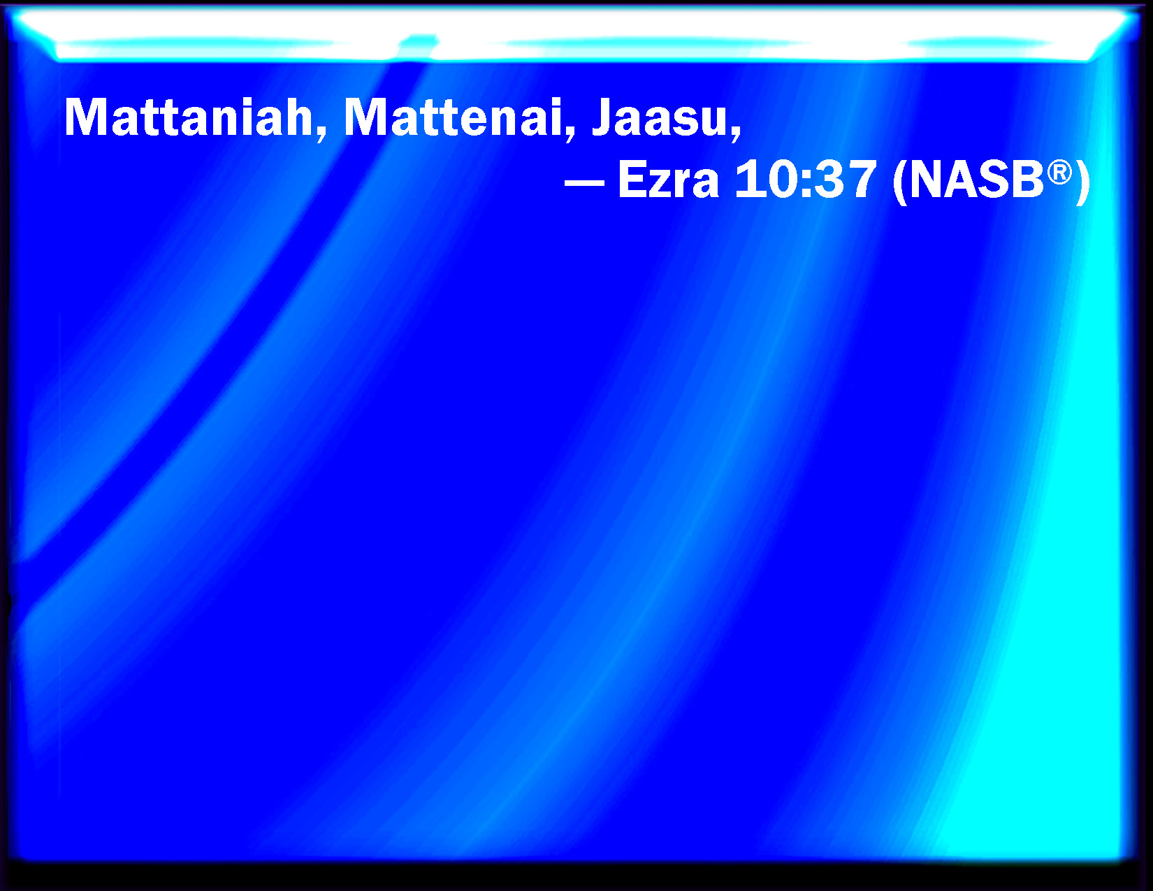 Bible Verse Slide Ezra 10:37 Mattaniah, Mattenai, and Jaasau, KJV: Mattaniah, Mattenai, and Jaasau, DRB: Mathanias, Mathania, and Jasi, DBT: Mattaniah, Mattenai, and Jaasai, ERV: Mattaniah, Mattenai, and Jaasu; WBT: Mattaniah, Mattenai, and Jaasau, WEB: Mattaniah, Mattenai, and Jaasu, YLT: Mattaniah, Mattenai, and Jaasau,Links Ezra 10:37 NIV • Ezra 10:37 NLT • Ezra 10:37 ESV • Ezra 10:37 NASB • Ezra 10:37 KJV • Ezra 10:37 Interlinear • Ezra 10:37 Commentaries • Ezra 10:37 Parallel Texts • Ezra 10:37 Bible Apps • Ezra 10:37 Parallel • Bible Hub |