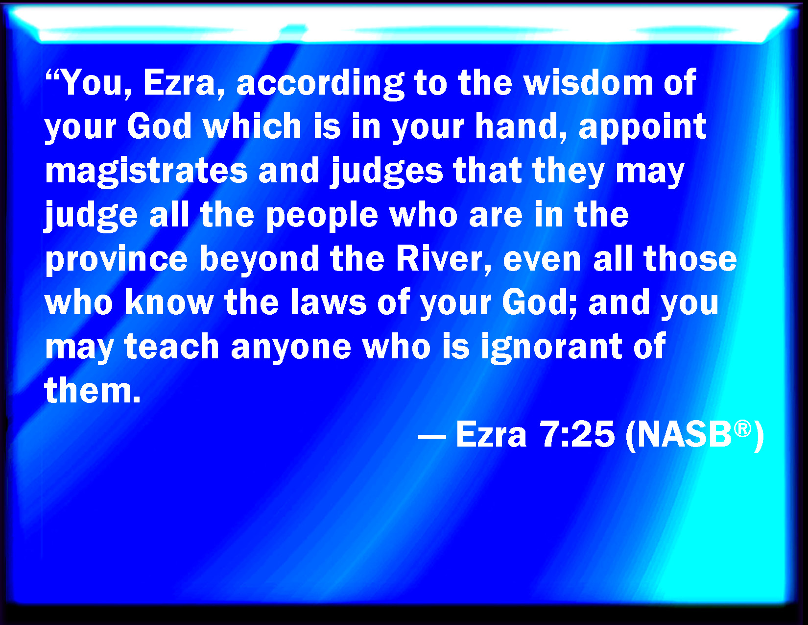 Bible Verse Slide Ezra 7:25 And you, Ezra, after the wisdom of your God, that is in your hand, set magistrates and judges, which may judge all the people that are beyond the river, all such as know the laws of your God; and teach you them that know them not. KJV: And thou, Ezra, after the wisdom of thy God, that is in thine hand, set magistrates and judges, which may judge all the people that are beyond the river, all such as know the laws of thy God; and teach ye them that know them not. DRB: And thou Esdras according to the wisdom of thy God, which is in thy hand, appoint judges and magistrates, that may judge all the people, that is beyond the river, that is, for them who know the law of thy God, yea and the ignorant teach ye freely. DBT: And thou, Ezra, after the wisdom of thy God, which is in thy hand, set magistrates and judges who may judge all the people that are beyond the river, all such as know the laws of thy God; and teach ye him that knows them not. ERV: And thou, Ezra, after the wisdom of thy God that is in thine hand, appoint magistrates and judges, which may judge all the people that are beyond the river, all such as know the laws of thy God; and teach ye him that knoweth them not. WBT: And thou, Ezra, after the wisdom of thy God, that is in thy hand, set magistrates and judges, who may judge all the people that are beyond the river, all such as know the laws of thy God; and teach ye them that know them not. WEB: You, Ezra, after the wisdom of your God who is in your hand, appoint magistrates and judges, who may judge all the people who are beyond the River, all such as know the laws of your God; and teach him who doesn't know them. YLT: And thou, Ezra, according to the wisdom of thy God, that is in thy hand, appoint magistrates and judges who may be judges to all the people who are beyond the river, to all knowing the law of thy God, and he who hath not known ye cause to know;Links Ezra 7:25 NIV • Ezra 7:25 NLT • Ezra 7:25 ESV • Ezra 7:25 NASB • Ezra 7:25 KJV • Ezra 7:25 Interlinear • Ezra 7:25 Commentaries • Ezra 7:25 Parallel Texts • Ezra 7:25 Bible Apps • Ezra 7:25 Parallel • Bible Hub |