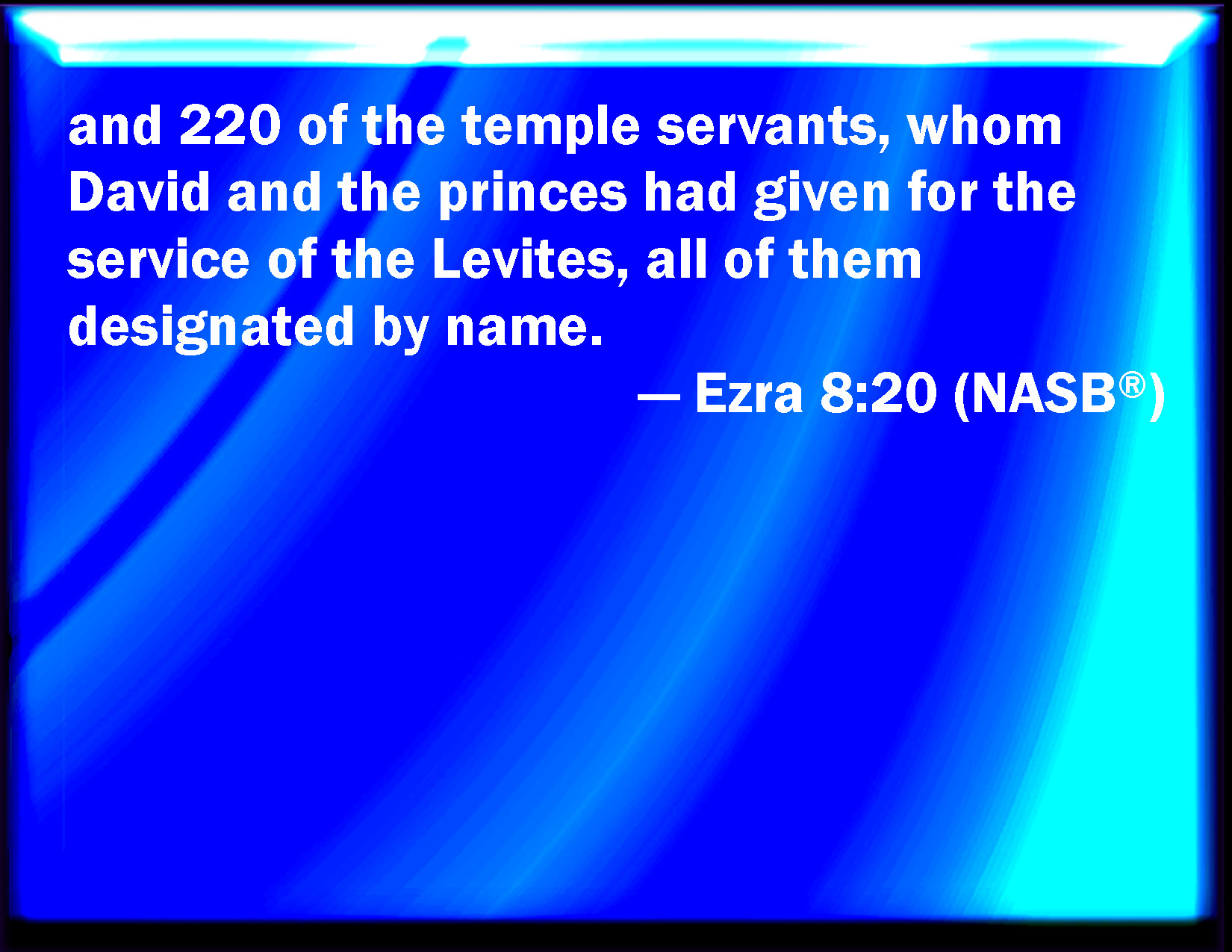 Bible Verse Slide Ezra 8:20 Also of the Nethinims, whom David and the princes had appointed for the service of the Levites, two hundred and twenty Nethinims: all of them were expressed by name. KJV: Also of the Nethinims, whom David and the princes had appointed for the service of the Levites, two hundred and twenty Nethinims: all of them were expressed by name. DRB: And of the Nathinites, whom David, and the princes gave for the service of the Levites, Nathinites two hundred and twenty: all these were called by their names. DBT: and of the Nethinim, whom David and the princes had appointed for the service of the Levites, two hundred and twenty Nethinim: all of them were expressed by name. ERV: and of the Nethinim, whom David and the princes had given for the service of the Levites, two hundred and twenty Nethinim: all of them were expressed by name. WBT: Also of the Nethinims, whom David and the princes had appointed for the service of the Levites, two hundred and twenty Nethinims: all of them were expressed by name. WEB: and of the Nethinim, whom David and the princes had given for the service of the Levites, two hundred and twenty Nethinim: all of them were mentioned by name. YLT: and from the Nethinim, whom David and the heads gave for the service of the Levites, two hundred and twenty Nethinim, all of them defined by name.Links Ezra 8:20 NIV • Ezra 8:20 NLT • Ezra 8:20 ESV • Ezra 8:20 NASB • Ezra 8:20 KJV • Ezra 8:20 Interlinear • Ezra 8:20 Commentaries • Ezra 8:20 Parallel Texts • Ezra 8:20 Bible Apps • Ezra 8:20 Parallel • Bible Hub |