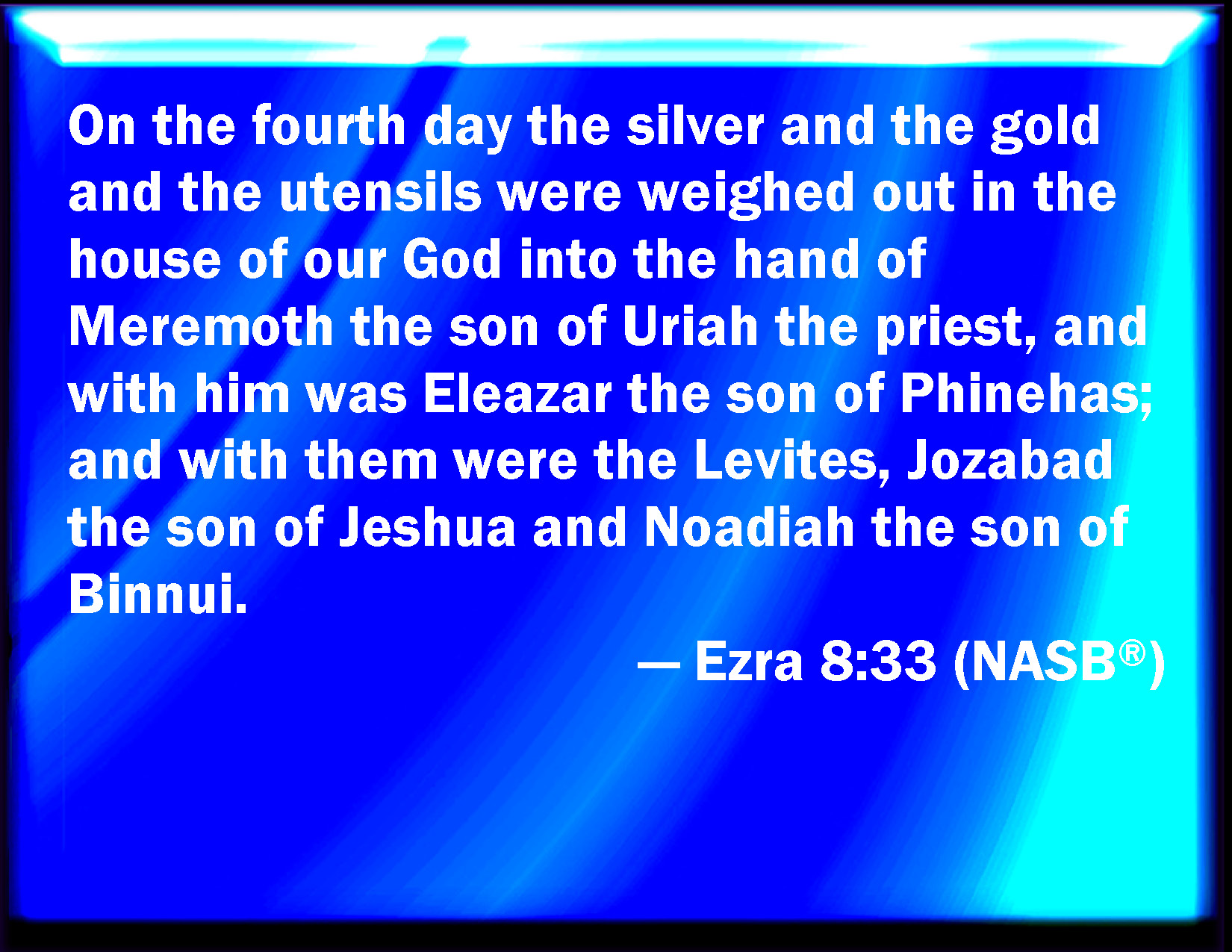 Bible Verse Slide Ezra 8:33 Now on the fourth day was the silver and the gold and the vessels weighed in the house of our God by the hand of Meremoth the son of Uriah the priest; and with him was Eleazar the son of Phinehas; and with them was Jozabad the son of Jeshua, and Noadiah the son of Binnui, Levites; KJV: Now on the fourth day was the silver and the gold and the vessels weighed in the house of our God by the hand of Meremoth the son of Uriah the priest; and with him was Eleazar the son of Phinehas; and with them was Jozabad the son of Jeshua, and Noadiah the son of Binnui, Levites; DRB: And on the fourth day the silver and the gold, and the vessels were weighed in the house of our God by the hand of Meremoth the son of Urias the priest, and with him was Eleazar the son of Phinees, and with them Jozabad the son of Josue, and Noadaia the son of Benoi, Levites. DBT: And on the fourth day the silver and the gold and the vessels were weighed in the house of our God into the hand of Meremoth the son of Urijah the priest; and with him was Eleazar the son of Phinehas; and with them were Jozabad the son of Jeshua, and Noadiah the son of Binnui, Levites: ERV: And on the fourth day was the silver and the gold and the vessels weighed in the house of our God into the hand of Meremoth the son of Uriah the priest; and with him was Eleazar the son of Phinehas; and with them was Jozabad the son of Jeshua, and Noadiah the son of Binnui, the Levites; WBT: Now on the fourth day was the silver and the gold and the vessels weighed in the house of our God by the hand of Meremoth the son of Uriah the priest; and with him was Eleazar the son of Phinehas; and with them was Jozabad the son of Jeshua, and Noadiah the son of Binnui, Levites; WEB: On the fourth day the silver and the gold and the vessels were weighed in the house of our God into the hand of Meremoth the son of Uriah the priest; and with him was Eleazar the son of Phinehas; and with them was Jozabad the son of Jeshua, and Noadiah the son of Binnui, the Levite; YLT: And on the fourth day hath been weighed the silver, and the gold, and the vessels, in the house of our God, unto the hand of Meremoth son of Uriah the priest, and with him Eleazar son of Phinehas, and with them Jozabad son of Jeshua, and Noadiah son of Binnui, the Levites:Links Ezra 8:33 NIV • Ezra 8:33 NLT • Ezra 8:33 ESV • Ezra 8:33 NASB • Ezra 8:33 KJV • Ezra 8:33 Interlinear • Ezra 8:33 Commentaries • Ezra 8:33 Parallel Texts • Ezra 8:33 Bible Apps • Ezra 8:33 Parallel • Bible Hub |