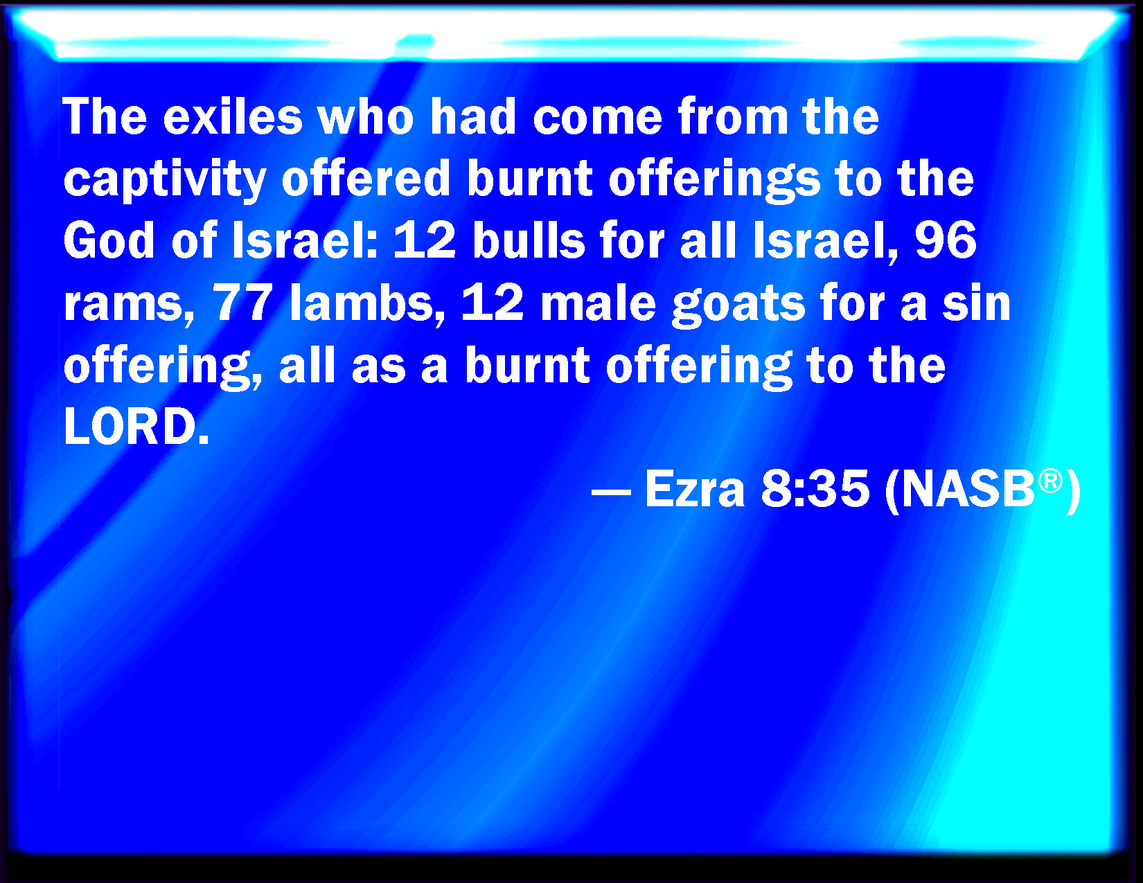 Bible Verse Slide Ezra 8:35 Also the children of those that had been carried away, which were come out of the captivity, offered burnt offerings to the God of Israel, twelve bullocks for all Israel, ninety and six rams, seventy and seven lambs, twelve he goats for a sin offering: all this was a burnt offering to the LORD. KJV: Also the children of those that had been carried away, which were come out of the captivity, offered burnt offerings unto the God of Israel, twelve bullocks for all Israel, ninety and six rams, seventy and seven lambs, twelve he goats for a sin offering: all this was a burnt offering unto the LORD. DRB: Moreover the children of them that had been carried away that were come out of the captivity, offered holocausts to the God of Israel, twelve calves for all the people of Israel, ninety-six rams, seventy- seven lambs, and twelve he goats for sin: all for a holocaust to the Lord. DBT: The children of those that had been carried away, who had come out of the captivity, presented burnt-offerings to the God of Israel, twelve bullocks for all Israel, ninety-six rams, seventy-seven lambs, twelve he-goats for a sin-offering: all for a burnt-offering to Jehovah. ERV: The children of the captivity, which were come out of exile, offered burnt offerings unto the God of Israel, twelve bullocks for all Israel, ninety and six rams, seventy and seven lambs, twelve he-goats for a sin offering: all this was a burnt offering unto the LORD. WBT: Also the children of those that had been carried away, who had come out of the captivity, offered burnt-offerings to the God of Israel, twelve bullocks for all Israel, ninety and six rams, seventy and seven lambs, twelve he-goats for a sin-offering: all this was a burnt-offering to the LORD. WEB: The children of the captivity, who had come out of exile, offered burnt offerings to the God of Israel, twelve bulls for all Israel, ninety-six rams, seventy-seven lambs, and twelve male goats for a sin offering: all this was a burnt offering to Yahweh. YLT: Those coming in of the captives — sons of the removal — have brought near burnt-offerings to the God of Israel, bullocks twelve, for all Israel, rams ninety and six, lambs seventy and seven, young he-goats for a sin-offering twelve — the whole a burnt-offering to Jehovah;Links Ezra 8:35 NIV • Ezra 8:35 NLT • Ezra 8:35 ESV • Ezra 8:35 NASB • Ezra 8:35 KJV • Ezra 8:35 Interlinear • Ezra 8:35 Commentaries • Ezra 8:35 Parallel Texts • Ezra 8:35 Bible Apps • Ezra 8:35 Parallel • Bible Hub |