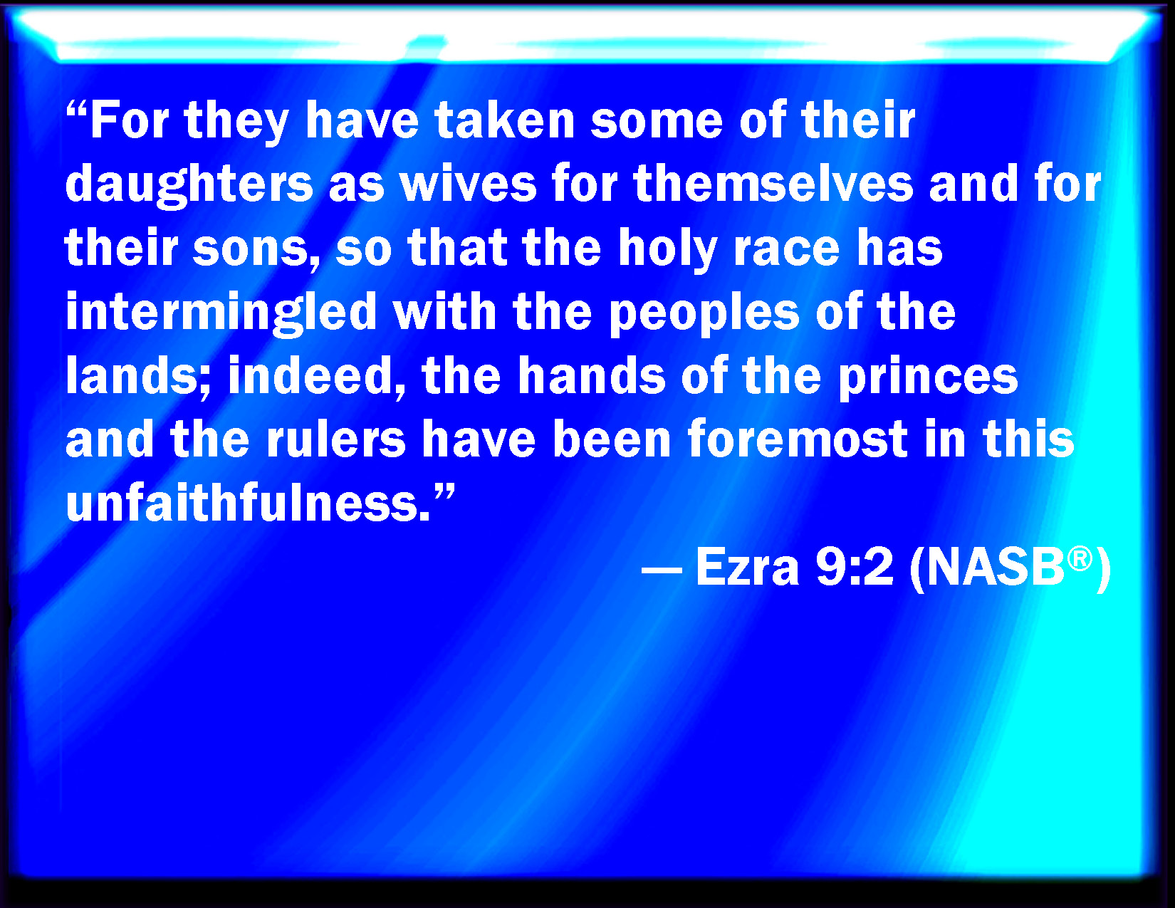 Bible Verse Slide Ezra 9:2 For they have taken of their daughters for themselves, and for their sons: so that the holy seed have mingled themselves with the people of those lands: yes, the hand of the princes and rulers has been chief in this trespass. KJV: For they have taken of their daughters for themselves, and for their sons: so that the holy seed have mingled themselves with the people of those lands: yea, the hand of the princes and rulers hath been chief in this trespass. DRB: For they have taken of their daughters for themselves and for their sons, and they have mingled the holy seed with the people of the lands. And the hand of the princes and magistrates hath been first in this transgression. DBT: for they have taken of their daughters for themselves and for their sons, and have mingled the holy seed with the peoples of the lands; and the hand of the princes and rulers has been chief in this unfaithfulness. ERV: For they have taken of their daughters for themselves and for their sons; so that the holy seed have mingled themselves with the peoples of the lands: yea, the hand of the princes and rulers hath been chief in this trespass. WBT: For they have taken of their daughters for themselves, and for their sons: so that the holy seed have mingled themselves with the people of those lands: yea, the hand of the princes and rulers hath been chief in this trespass. WEB: For they have taken of their daughters for themselves and for their sons, so that the holy seed have mixed themselves with the peoples of the lands. Yes, the hand of the princes and rulers has been chief in this trespass." YLT: for they have taken of their daughters to them, and to their sons, and the holy seed have mingled themselves among the peoples of the lands, and the hand of the heads and of the seconds have been first in this trespass.'Links Ezra 9:2 NIV • Ezra 9:2 NLT • Ezra 9:2 ESV • Ezra 9:2 NASB • Ezra 9:2 KJV • Ezra 9:2 Interlinear • Ezra 9:2 Commentaries • Ezra 9:2 Parallel Texts • Ezra 9:2 Bible Apps • Ezra 9:2 Parallel • Bible Hub |