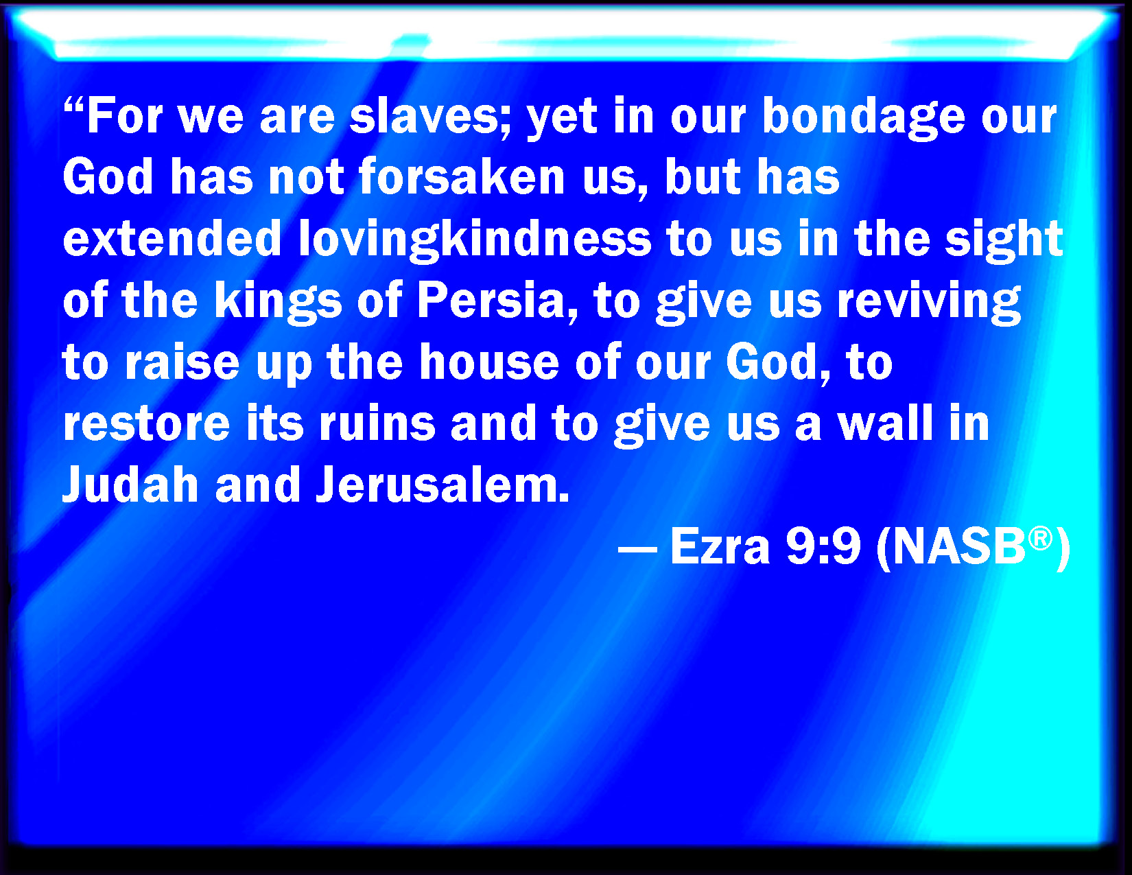 Bible Verse Slide Ezra 9:9 For we were slaves; yet our God has not forsaken us in our bondage, but has extended mercy to us in the sight of the kings of Persia, to give us a reviving, to set up the house of our God, and to repair the desolations thereof, and to give us a wall in Judah and in Jerusalem. KJV: For we were bondmen; yet our God hath not forsaken us in our bondage, but hath extended mercy unto us in the sight of the kings of Persia, to give us a reviving, to set up the house of our God, and to repair the desolations thereof, and to give us a wall in Judah and in Jerusalem. DRB: For we are bondmen, and in our bondage our God hath not forsaken us, but hath extended mercy upon us before the king of the Persians, to give us life, and to set up the house of our God, and rebuild the desolations thereof, and to give us a fence in Juda and Jerusalem. DBT: For we are bondmen; yet our God hath not forsaken us in our bondage, but hath extended mercy unto us before the kings of Persia, to give us a reviving, to set up the house of our God and to repair the ruins thereof, and to give us a wall in Judah and in Jerusalem. ERV: For we are bondmen; yet our God hath not forsaken us in our bondage, but hath extended mercy unto us in the sight of the kings of Persia, to give us a reviving, to set up the house of our God, and to repair the ruins thereof, and to give us a wall in Judah and in Jerusalem. WBT: For we were bond-men; yet our God hath not forsaken us in our bondage, but hath extended mercy to us in the sight of the kings of Persia, to give us a reviving, to set up the house of our God, and to repair the desolations of it, and to give us a wall in Judah and in Jerusalem. WEB: For we are bondservants; yet our God has not forsaken us in our bondage, but has extended loving kindness to us in the sight of the kings of Persia, to give us a reviving, to set up the house of our God, and to repair its ruins, and to give us a wall in Judah and in Jerusalem. YLT: for servants we are, and in our servitude our God hath not forsaken us, and stretcheth out unto us kindness before the kings of Persia, to give to us a quickening to lift up the house of our God, and to cause its wastes to cease, and to give to us a wall in Judah and in Jerusalem.Links Ezra 9:9 NIV • Ezra 9:9 NLT • Ezra 9:9 ESV • Ezra 9:9 NASB • Ezra 9:9 KJV • Ezra 9:9 Interlinear • Ezra 9:9 Commentaries • Ezra 9:9 Parallel Texts • Ezra 9:9 Bible Apps • Ezra 9:9 Parallel • Bible Hub |