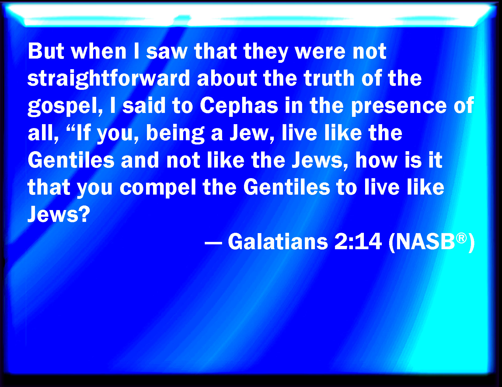 Bible Verse Slide Galatians 2:14 But when I saw that they walked not uprightly according to the truth of the gospel, I said to Peter before them all, If you, being a Jew, live after the manner of Gentiles, and not as do the Jews, why compel you the Gentiles to live as do the Jews? KJV: But when I saw that they walked not uprightly according to the truth of the gospel, I said unto Peter before them all, If thou, being a Jew, livest after the manner of Gentiles, and not as do the Jews, why compellest thou the Gentiles to live as do the Jews? DRB: But when I saw that they walked not uprightly unto the truth of the gospel, I said to Cephas before them all: If thou, being a Jew, livest after the manner of the Gentiles, and not as the Jews do, how dost thou compel the Gentiles to live as do the Jews? DBT: But when I saw that they do not walk straightforwardly, according to the truth of the glad tidings, I said to Peter before all, If thou, being a Jew, livest as the nations and not as the Jews, how dost thou compel the nations to Judaize? ERV: But when I saw that they walked not uprightly according to the truth of the gospel, I said unto Cephas before them all, If thou, being a Jew, livest as do the Gentiles, and not as do the Jews, how compellest thou the Gentiles to live as do the Jews? WBT: But when I saw that they walked not uprightly according to the truth of the gospel, I said to Peter before them all, If thou, being a Jew, livest after the manner of Gentiles, and not as do the Jews, why compellest thou the Gentiles to live as do the Jews? WEB: But when I saw that they didn't walk uprightly according to the truth of the Good News, I said to Peter before them all, "If you, being a Jew, live as the Gentiles do, and not as the Jews do, why do you compel the Gentiles to live as the Jews do? YLT: But when I saw that they are not walking uprightly to the truth of the good news, I said to Peter before all, 'If thou, being a Jew, in the manner of the nations dost live, and not in the manner of the Jews, how the nations dost thou compel to Judaize?Links Galatians 2:14 NIV • Galatians 2:14 NLT • Galatians 2:14 ESV • Galatians 2:14 NASB • Galatians 2:14 KJV • Galatians 2:14 Interlinear • Galatians 2:14 Commentaries • Galatians 2:14 Parallel Texts • Galatians 2:14 Bible Apps • Galatians 2:14 Parallel • Bible Hub |