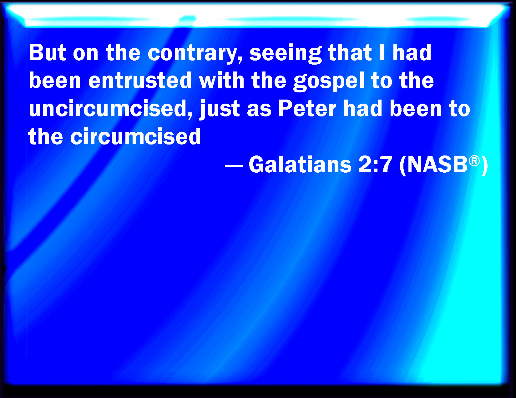 Bible Verse Slide Galatians 2:7 But contrariwise, when they saw that the gospel of the uncircumcision was committed to me, as the gospel of the circumcision was to Peter; KJV: But contrariwise, when they saw that the gospel of the uncircumcision was committed unto me, as the gospel of the circumcision was unto Peter; DRB: But contrariwise, when they had seen that to me was committed the gospel of the uncircumcision, as to Peter was that of the circumcision. DBT: but, on the contrary, seeing that the glad tidings of the uncircumcision were confided to me, even as to Peter that of the circumcision, ERV: but contrariwise, when they saw that I had been intrusted with the gospel of the uncircumcision, even as Peter with the gospel of the circumcision WBT: But on the contrary, when they saw that the gospel of the uncircumcision was committed to me, as the gospel of the circumcision was to Peter; WEB: but to the contrary, when they saw that I had been entrusted with the Good News for the uncircumcision, even as Peter with the Good News for the circumcision YLT: but, on the contrary, having seen that I have been entrusted with the good news of the uncircumcision, as Peter with that of the circumcision,Links Galatians 2:7 NIV • Galatians 2:7 NLT • Galatians 2:7 ESV • Galatians 2:7 NASB • Galatians 2:7 KJV • Galatians 2:7 Interlinear • Galatians 2:7 Commentaries • Galatians 2:7 Parallel Texts • Galatians 2:7 Bible Apps • Galatians 2:7 Parallel • Bible Hub |