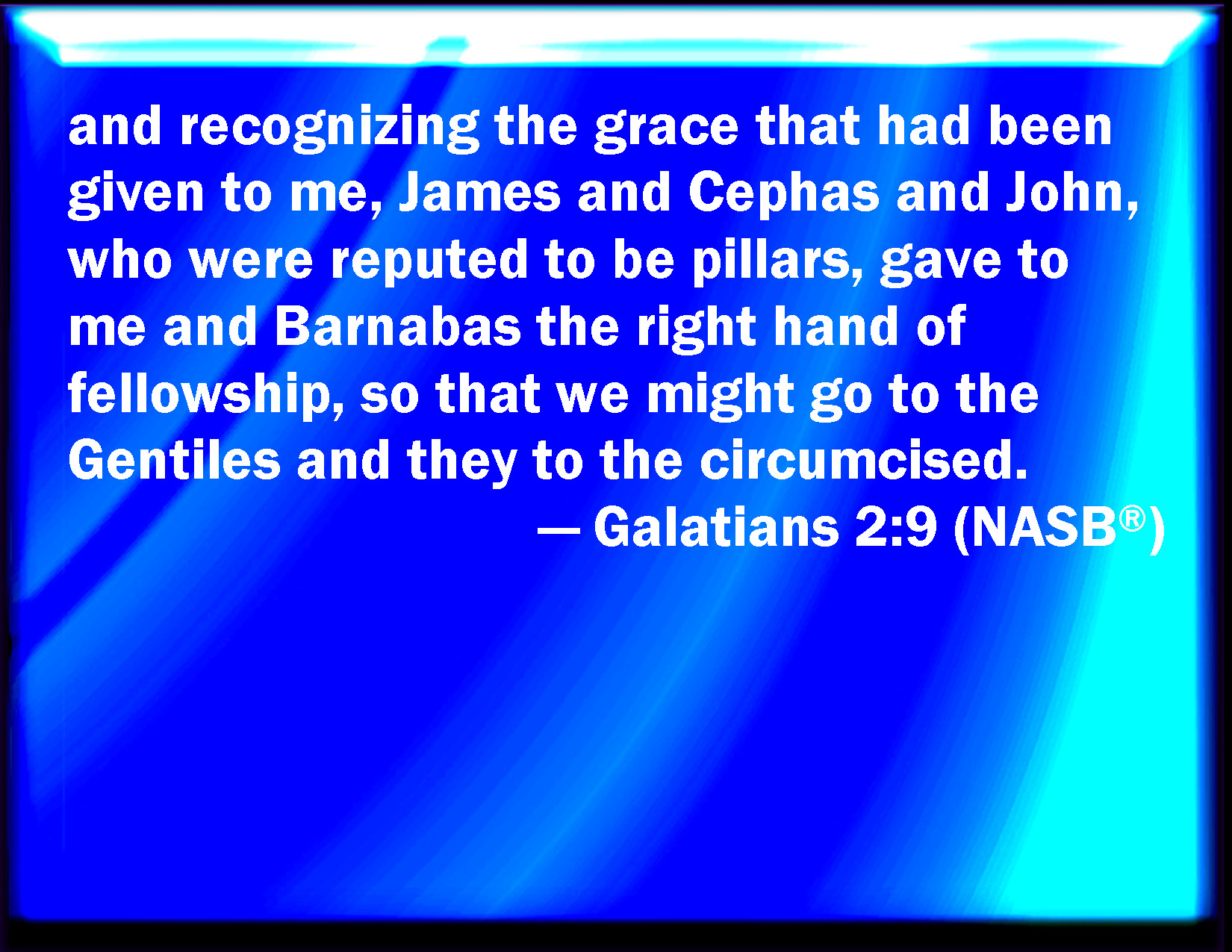 Bible Verse Slide Galatians 2:9 And when James, Cephas, and John, who seemed to be pillars, perceived the grace that was given to me, they gave to me and Barnabas the right hands of fellowship; that we should go to the heathen, and they to the circumcision. KJV: And when James, Cephas, and John, who seemed to be pillars, perceived the grace that was given unto me, they gave to me and Barnabas the right hands of fellowship; that we should go unto the heathen, and they unto the circumcision. DRB: And when they had known the grace that was given to me, James and Cephas and John, who seemed to be pillars, gave to me and Barnabas the right hands of fellowship: that we should go unto the Gentiles, and they unto the circumcision: DBT: and recognising the grace given to me, James and Cephas and John, who were conspicuous as being pillars, gave to me and Barnabas the right hands of fellowship, that we should go to the nations, and they to the circumcision; ERV: and when they perceived the grace that was given unto me, James and Cephas and John, they who were reputed to be pillars, gave to me and Barnabas the right hands of fellowship, that we should go unto the Gentiles, and they unto the circumcision; WBT: And when James, Cephas, and John, who seemed to be pillars, perceived the grace that was given to me, they gave to me and Barnabas the right hands of fellowship; that we should go to the heathen, and they to the circumcision. WEB: and when they perceived the grace that was given to me, James and Cephas and John, they who were reputed to be pillars, gave to me and Barnabas the right hand of fellowship, that we should go to the Gentiles, and they to the circumcision. YLT: and having known the grace that was given to me, James, and Cephas, and John, who were esteemed to be pillars, a right hand of fellowship they did give to me, and to Barnabas, that we to the nations, and they to the circumcision may go,Links Galatians 2:9 NIV • Galatians 2:9 NLT • Galatians 2:9 ESV • Galatians 2:9 NASB • Galatians 2:9 KJV • Galatians 2:9 Interlinear • Galatians 2:9 Commentaries • Galatians 2:9 Parallel Texts • Galatians 2:9 Bible Apps • Galatians 2:9 Parallel • Bible Hub |