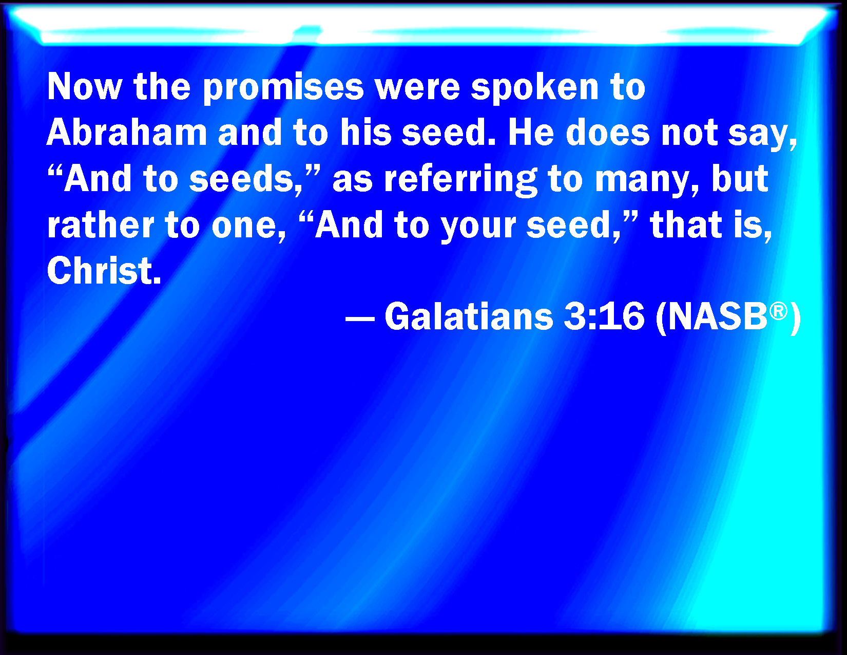 Bible Verse Slide Galatians 3:16 Now to Abraham and his seed were the promises made. He said not, And to seeds, as of many; but as of one, And to your seed, which is Christ. KJV: Now to Abraham and his seed were the promises made. He saith not, And to seeds, as of many; but as of one, And to thy seed, which is Christ. DRB: To Abraham were the promises made and to his seed. He saith not, And to his seeds, as of many: but as of one, And to thy seed, which is Christ. DBT: But to Abraham were the promises addressed, and to his seed: he does not say, And to seeds, as of many; but as of one, And to thy seed; which is Christ. ERV: Now to Abraham were the promises spoken, and to his seed. He saith not, And to seeds, as of many; but as of one, And to thy seed, which is Christ. WBT: Now to Abraham and his seed were the promises made. He saith not, And to seeds, as of many; but as of one, And to thy seed, which is Christ. WEB: Now the promises were spoken to Abraham and to his seed. He doesn't say, "To seeds," as of many, but as of one, "To your seed," which is Christ. YLT: and to Abraham were the promises spoken, and to his seed; He doth not say, 'And to seeds,' as of many, but as of one, 'And to thy seed,' which is Christ;Links Galatians 3:16 NIV • Galatians 3:16 NLT • Galatians 3:16 ESV • Galatians 3:16 NASB • Galatians 3:16 KJV • Galatians 3:16 Interlinear • Galatians 3:16 Commentaries • Galatians 3:16 Parallel Texts • Galatians 3:16 Bible Apps • Galatians 3:16 Parallel • Bible Hub |