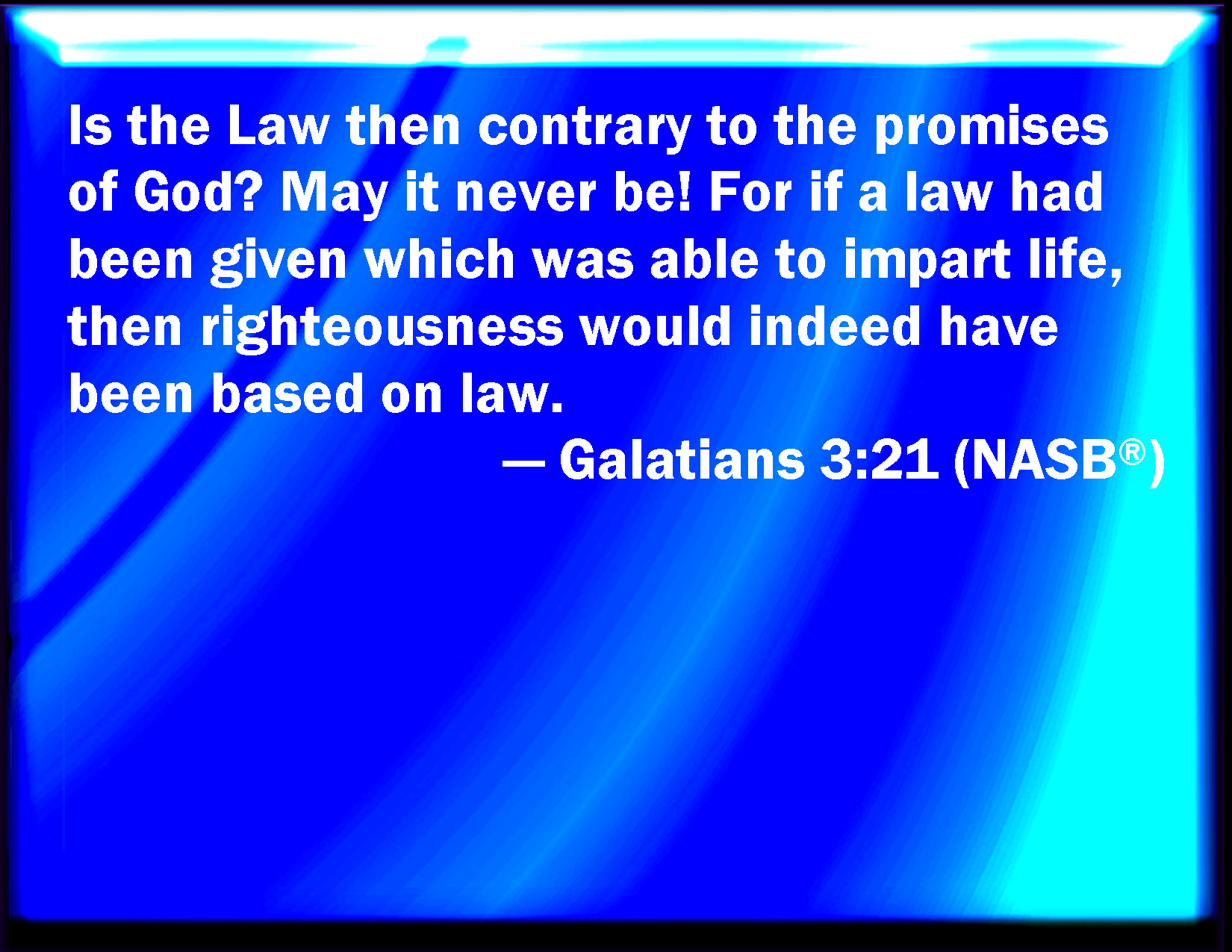 Bible Verse Slide Galatians 3:21 Is the law then against the promises of God? God forbid: for if there had been a law given which could have given life, truly righteousness should have been by the law. KJV: Is the law then against the promises of God? God forbid: for if there had been a law given which could have given life, verily righteousness should have been by the law. DRB: Was the law then against the promises of God? God forbid. For if there had been a law given which could give life, verily justice should have been by the law. DBT: Is then the law against the promises of God? Far be the thought. For if a law had been given able to quicken, then indeed righteousness were on the principle of law; ERV: Is the law then against the promises of God? God forbid: for if there had been a law given which could make alive, verily righteousness would have been of the law. WBT: Is the law then against the promises of God? By no means: for if there had been a law given which could give life, verily righteousness would have been by the law. WEB: Is the law then against the promises of God? Certainly not! For if there had been a law given which could make alive, most certainly righteousness would have been of the law. YLT: the law, then, is against the promises of God? — let it not be! for if a law was given that was able to make alive, truly by law there would have been the righteousness,Links Galatians 3:21 NIV • Galatians 3:21 NLT • Galatians 3:21 ESV • Galatians 3:21 NASB • Galatians 3:21 KJV • Galatians 3:21 Interlinear • Galatians 3:21 Commentaries • Galatians 3:21 Parallel Texts • Galatians 3:21 Bible Apps • Galatians 3:21 Parallel • Bible Hub |