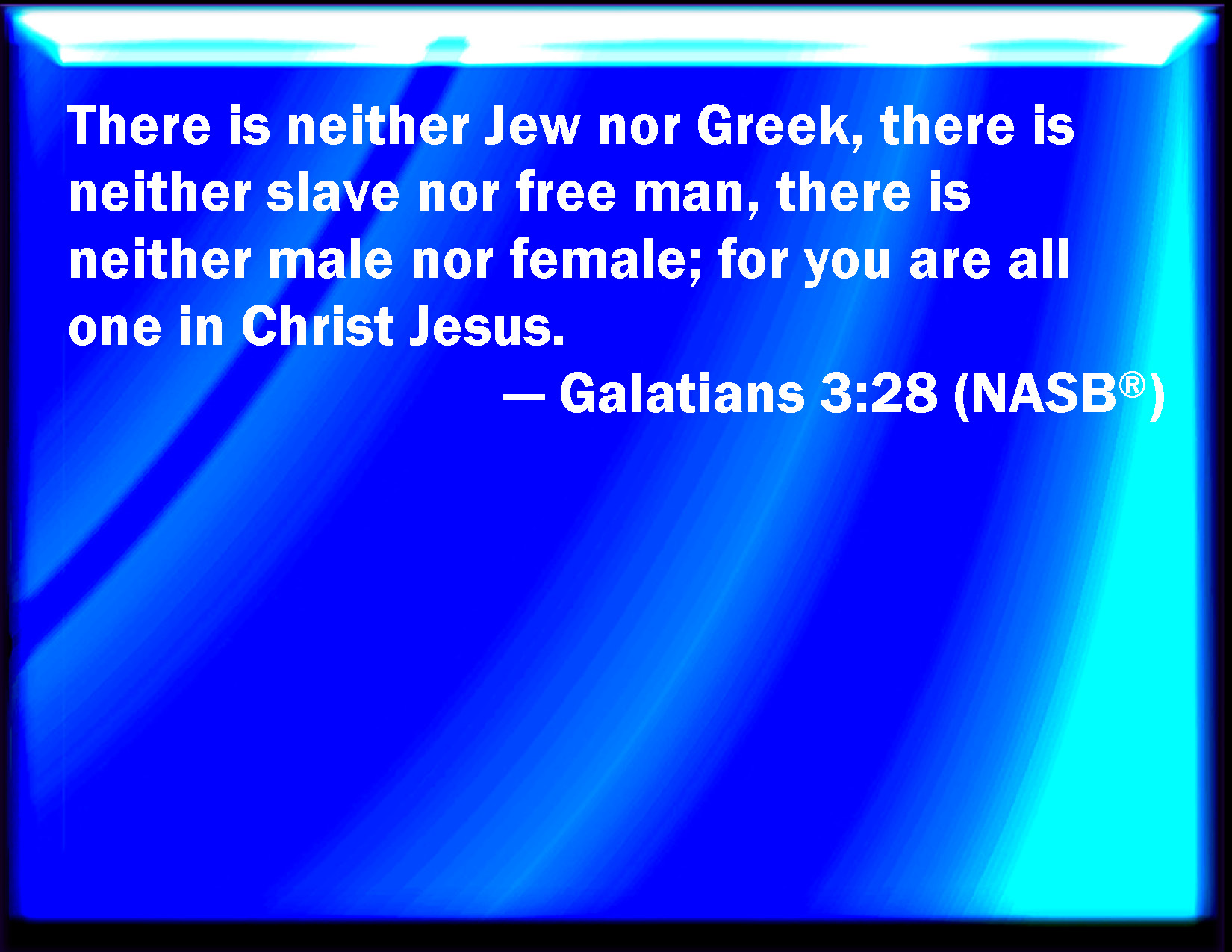 Bible Verse Slide Galatians 3:28 There is neither Jew nor Greek, there is neither bond nor free, there is neither male nor female: for you are all one in Christ Jesus. KJV: There is neither Jew nor Greek, there is neither bond nor free, there is neither male nor female: for ye are all one in Christ Jesus. DRB: There is neither Jew nor Greek: there is neither bond nor free: there is neither male nor female. For you are all one in Christ Jesus. DBT: There is no Jew nor Greek; there is no bondman nor freeman; there is no male and female; for ye are all one in Christ Jesus: ERV: There can be neither Jew nor Greek, there can be neither bond nor free, there can be no male and female: for ye all are one man in Christ Jesus. WBT: There is neither Jew nor Greek, there is neither bond nor free, there is neither male nor female: for ye are all one in Christ Jesus. WEB: There is neither Jew nor Greek, there is neither slave nor free man, there is neither male nor female; for you are all one in Christ Jesus. YLT: there is not here Jew or Greek, there is not here servant nor freeman, there is not here male and female, for all ye are one in Christ Jesus;Links Galatians 3:28 NIV • Galatians 3:28 NLT • Galatians 3:28 ESV • Galatians 3:28 NASB • Galatians 3:28 KJV • Galatians 3:28 Interlinear • Galatians 3:28 Commentaries • Galatians 3:28 Parallel Texts • Galatians 3:28 Bible Apps • Galatians 3:28 Parallel • Bible Hub |