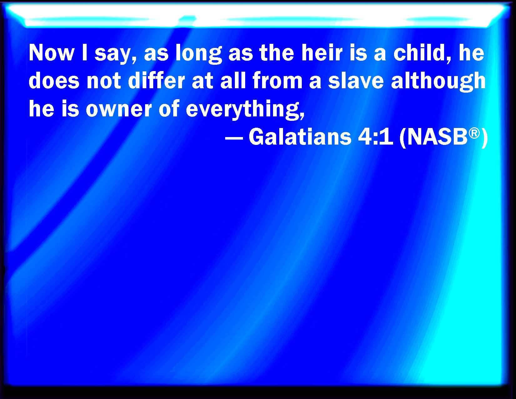 Bible Verse Slide Galatians 4:1 Now I say, That the heir, as long as he is a child, differs nothing from a servant, though he be lord of all; KJV: Now I say, That the heir, as long as he is a child, differeth nothing from a servant, though he be lord of all; DRB: Now I say, as long as the heir is a child, he differeth nothing from a servant, though he be lord of all; DBT: Now I say, As long as the heir is a child, he differs nothing from a bondman, though he be lord of all; ERV: But I say that so long as the heir is a child, he differeth nothing from a bondservant, though he is lord of all; WBT: Now I say, That the heir, as long as he is a child, differeth nothing from a servant, though he is lord of all; WEB: But I say that so long as the heir is a child, he is no different from a bondservant, though he is lord of all; YLT: And I say, so long time as the heir is a babe, he differeth nothing from a servant — being lord of all,Links Galatians 4:1 NIV • Galatians 4:1 NLT • Galatians 4:1 ESV • Galatians 4:1 NASB • Galatians 4:1 KJV • Galatians 4:1 Interlinear • Galatians 4:1 Commentaries • Galatians 4:1 Parallel Texts • Galatians 4:1 Bible Apps • Galatians 4:1 Parallel • Bible Hub |