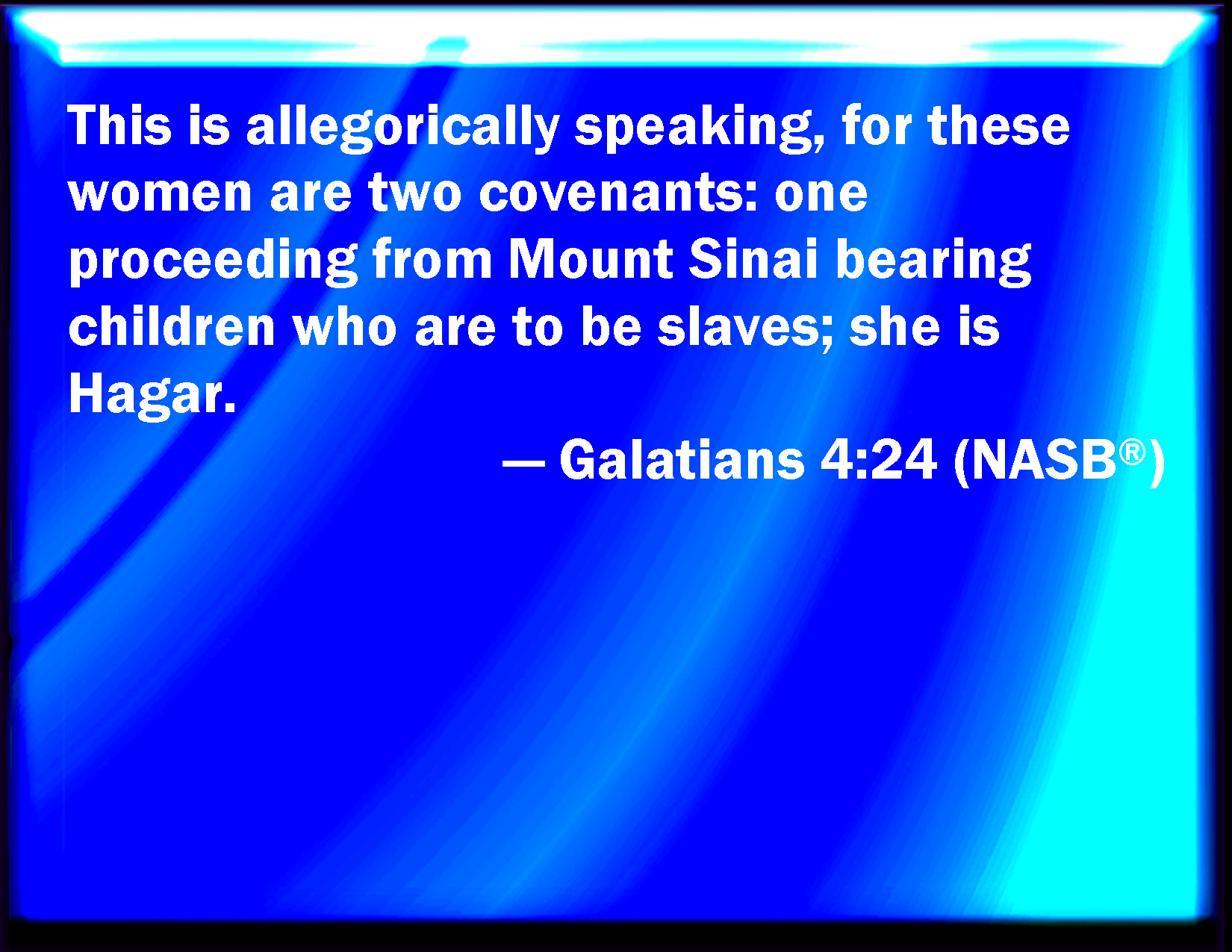Bible Verse Slide Galatians 4:24 Which things are an allegory: for these are the two covenants; the one from the mount Sinai, which engenders to bondage, which is Agar. KJV: Which things are an allegory: for these are the two covenants; the one from the mount Sinai, which gendereth to bondage, which is Agar. DRB: Which things are said by an allegory. For these are the two testaments. The one from mount Sina, engendering unto bondage; which is Agar: DBT: Which things have an allegorical sense; for these are two covenants: one from mount Sinai, gendering to bondage, which is Hagar. ERV: Which things contain an allegory: for these women are two covenants; one from mount Sinai, bearing children unto bondage, which is Hagar. WBT: Which things are an allegory: for these are the two covenants; the one from the mount Sinai, which gendereth to bondage, which is Agar. WEB: These things contain an allegory, for these are two covenants. One is from Mount Sinai, bearing children to bondage, which is Hagar. YLT: which things are allegorized, for these are the two covenants: one, indeed, from mount Sinai, to servitude bringing forth, which is Hagar;Links Galatians 4:24 NIV • Galatians 4:24 NLT • Galatians 4:24 ESV • Galatians 4:24 NASB • Galatians 4:24 KJV • Galatians 4:24 Interlinear • Galatians 4:24 Commentaries • Galatians 4:24 Parallel Texts • Galatians 4:24 Bible Apps • Galatians 4:24 Parallel • Bible Hub |