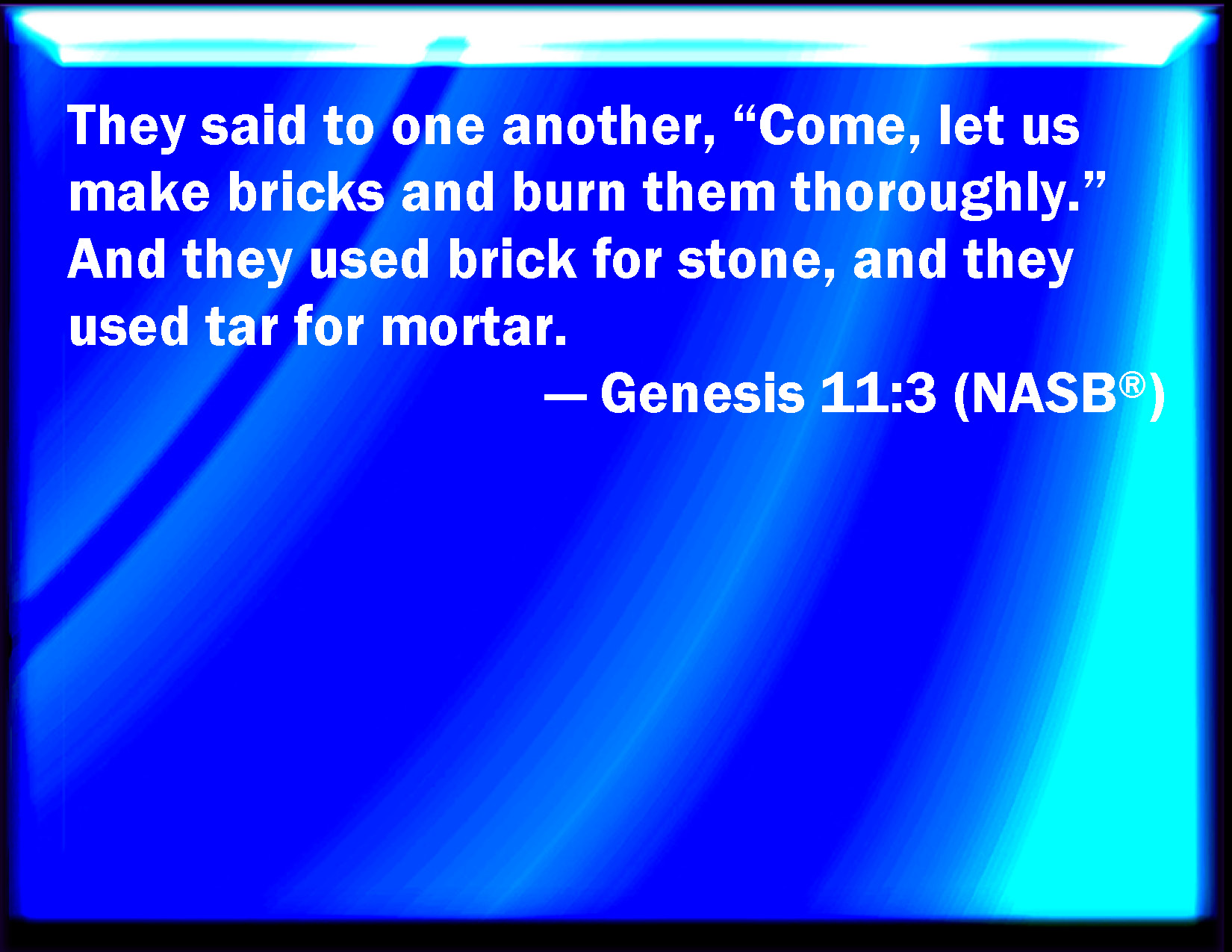 Bible Verse Slide Genesis 11:3 And they said one to another, Go to, let us make brick, and burn them thoroughly. And they had brick for stone, and slime had they for mortar. KJV: And they said one to another, Go to, let us make brick, and burn them throughly. And they had brick for stone, and slime had they for morter. DRB: And each one said to his neighbour: Come, let us make brick, and bake them of stones, and slime instead of mortar. DBT: And they said one to another, Come on, let us make bricks, and burn them thoroughly. And they had brick for stone, and they had asphalt for mortar. ERV: And they said one to another, Go to, let us make brick, and burn them throughly. And they had brick for stone, and slime had they for mortar. WBT: And they said one to another, come, let us make brick, and burn them thoroughly. And they had brick for stone, and slime had they for mortar. WEB: They said one to another, "Come, let's make bricks, and burn them thoroughly." They had brick for stone, and they used tar for mortar. YLT: and they say each one to his neighbour, 'Give help, let us make bricks, and burn them thoroughly:' and the brick is to them for stone, and the bitumen hath been to them for mortar.Links Genesis 11:3 NIV • Genesis 11:3 NLT • Genesis 11:3 ESV • Genesis 11:3 NASB • Genesis 11:3 KJV • Genesis 11:3 Interlinear • Genesis 11:3 Commentaries • Genesis 11:3 Parallel Texts • Genesis 11:3 Bible Apps • Genesis 11:3 Parallel • Bible Hub |