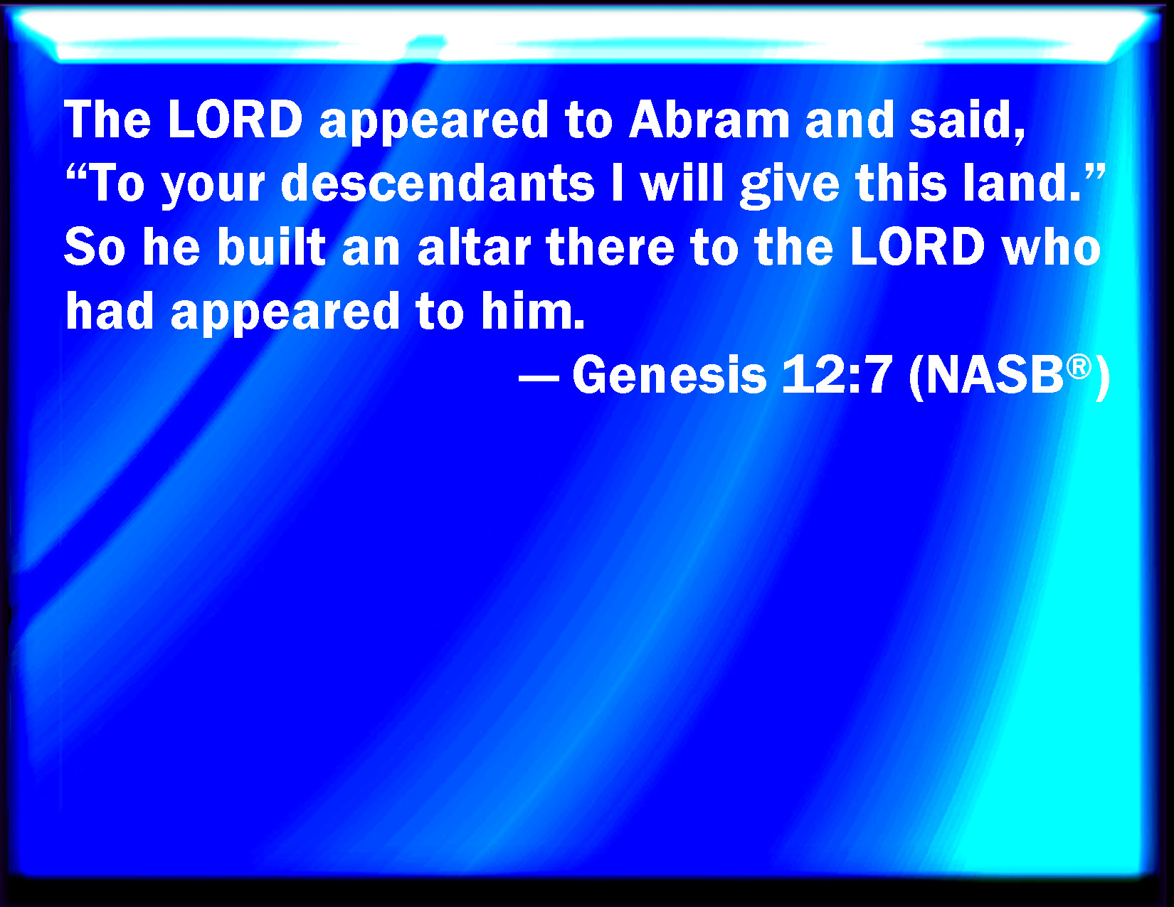 Bible Verse Slide Genesis 12:7 And the LORD appeared to Abram, and said, To your seed will I give this land: and there built he an altar to the LORD, who appeared to him. KJV: And the LORD appeared unto Abram, and said, Unto thy seed will I give this land: and there builded he an altar unto the LORD, who appeared unto him. DRB: And the Lord appeared to Abram, and said to him: To thy seed will I give this land. And he built there an altar to the Lord, who had appeared to him. DBT: And Jehovah appeared to Abram, and said, Unto thy seed will I give this land. And there he built an altar to Jehovah who had appeared to him. ERV: And the LORD appeared unto Abram, and said, Unto thy seed will I give this land: and there builded he an altar unto the LORD, who appeared unto him. WBT: And the LORD appeared to Abram, and said, To thy seed will I give this land: and there he erected an altar to the LORD, who appeared to him. WEB: Yahweh appeared to Abram and said, "I will give this land to your seed." He built an altar there to Yahweh, who appeared to him. YLT: And Jehovah appeareth unto Abram, and saith, 'To thy seed I give this land;' and he buildeth there an altar to Jehovah, who hath appeared unto him.Links Genesis 12:7 NIV • Genesis 12:7 NLT • Genesis 12:7 ESV • Genesis 12:7 NASB • Genesis 12:7 KJV • Genesis 12:7 Interlinear • Genesis 12:7 Commentaries • Genesis 12:7 Parallel Texts • Genesis 12:7 Bible Apps • Genesis 12:7 Parallel • Bible Hub |