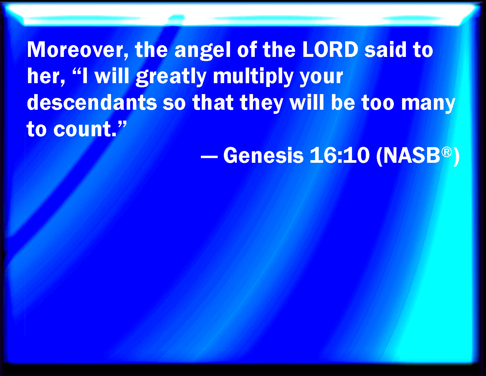 Bible Verse Slide Genesis 16:10 And the angel of the LORD said to her, I will multiply your seed exceedingly, that it shall not be numbered for multitude. KJV: And the angel of the LORD said unto her, I will multiply thy seed exceedingly, that it shall not be numbered for multitude. DRB: And again he said: I will multiply thy seed exceedingly, and it shall not be numbered for multitude. DBT: And the Angel of Jehovah said to her, I will multiply thy seed exceedingly, that it shall not be numbered for multitude. ERV: And the angel of the LORD said unto her, I will greatly multiply thy seed, that it shall not be numbered for multitude. WBT: And the angel of the LORD said to her, I will multiply thy seed exceedingly, that it shall not be numbered for multitude. WEB: The angel of Yahweh said to her, "I will greatly multiply your seed, that they will not be numbered for multitude." YLT: and the messenger of Jehovah saith to her, 'Multiplying I multiply thy seed, and it is not numbered from multitude;'Links Genesis 16:10 NIV • Genesis 16:10 NLT • Genesis 16:10 ESV • Genesis 16:10 NASB • Genesis 16:10 KJV • Genesis 16:10 Interlinear • Genesis 16:10 Commentaries • Genesis 16:10 Parallel Texts • Genesis 16:10 Bible Apps • Genesis 16:10 Parallel • Bible Hub |
