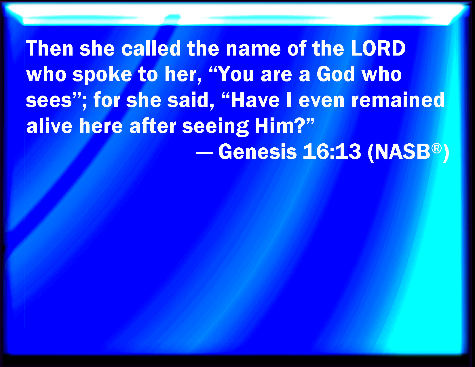 Bible Verse Slide Genesis 16:13 And she called the name of the LORD that spoke to her, You God see me: for she said, Have I also here looked after him that sees me? KJV: And she called the name of the LORD that spake unto her, Thou God seest me: for she said, Have I also here looked after him that seeth me? DRB: And she called the name of the Lord that spoke unto her: Thou the God who hast seen me. For she said: Verily here have I seen the hinder parts of him that seeth me. DBT: And she called the name of Jehovah who spoke to her, Thou art the God who reveals himself, for she said, Also here have I seen after he has revealed himself. ERV: And she called the name of the LORD that spake unto her, Thou art a God that seeth: for she said, Have I even here looked after him that seeth me? WBT: And she called the name of the LORD that spoke to her, Thou God seest me: for she said, Have I also here looked after him that seeth me? WEB: She called the name of Yahweh who spoke to her, "You are a God who sees," for she said, "Have I even stayed alive after seeing him?" YLT: And she calleth the name of Jehovah who is speaking unto her, 'Thou art, O God, my beholder;' for she said, 'Even here have I looked behind my beholder?'Links Genesis 16:13 NIV • Genesis 16:13 NLT • Genesis 16:13 ESV • Genesis 16:13 NASB • Genesis 16:13 KJV • Genesis 16:13 Interlinear • Genesis 16:13 Commentaries • Genesis 16:13 Parallel Texts • Genesis 16:13 Bible Apps • Genesis 16:13 Parallel • Bible Hub |