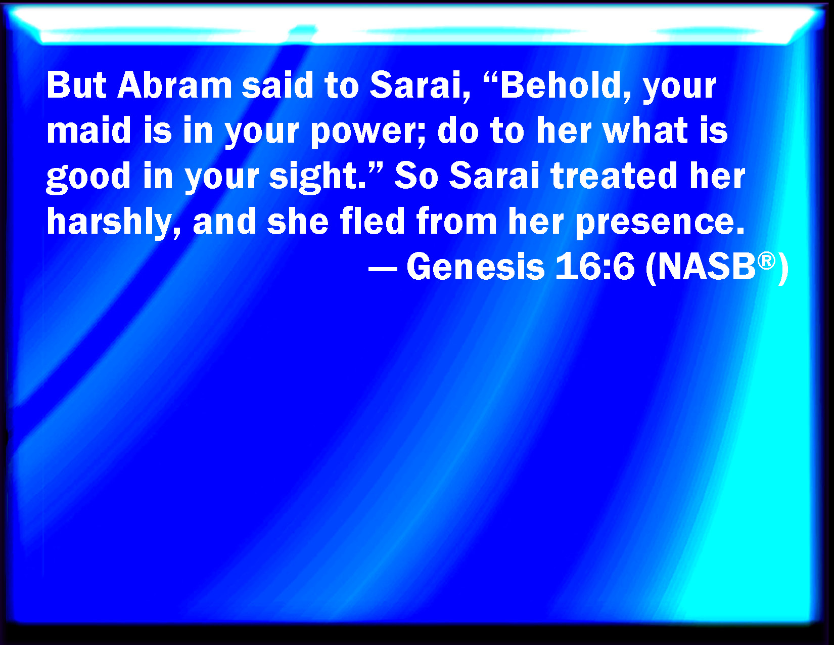 Bible Verse Slide Genesis 16:6 But Abram said to Sarai, Behold, your maid is in your hand; do to her as it pleases you. And when Sarai dealt hardly with her, she fled from her face. KJV: But Abram said unto Sarai, Behold, thy maid is in thy hand; do to her as it pleaseth thee. And when Sarai dealt hardly with her, she fled from her face. DRB: And Abram made answer, and said to her: Behold thy handmaid is in thy own hand, use her its it pleaseth thee. And when Sarai afflicted her, she ran away. DBT: And Abram said to Sarai, Behold, thy maidservant is in thy hand: do to her what is good in thine eyes. And Sarai oppressed her; and she fled from her face. ERV: But Abram said unto Sarai, Behold, thy maid is in thy hand; do to her that which is good in thine eyes. And Sarai dealt hardly with her, and she fled from her face. WBT: But Abram said to Sarai, Behold, thy maid is in thy hand; do to her as it pleaseth thee. And when Sarai dealt hardly with her, she fled from her face. WEB: But Abram said to Sarai, "Behold, your maid is in your hand. Do to her whatever is good in your eyes." Sarai dealt harshly with her, and she fled from her face. YLT: And Abram saith unto Sarai, 'Lo, thine handmaid is in thine hand, do to her that which is good in thine eyes;' and Sarai afflicted her, and she fleeth from her presence.Links Genesis 16:6 NIV • Genesis 16:6 NLT • Genesis 16:6 ESV • Genesis 16:6 NASB • Genesis 16:6 KJV • Genesis 16:6 Interlinear • Genesis 16:6 Commentaries • Genesis 16:6 Parallel Texts • Genesis 16:6 Bible Apps • Genesis 16:6 Parallel • Bible Hub |