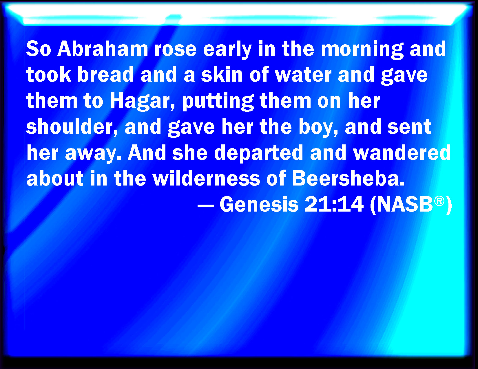 Bible Verse Slide Genesis 21:14 And Abraham rose up early in the morning, and took bread, and a bottle of water, and gave it to Hagar, putting it on her shoulder, and the child, and sent her away: and she departed, and wandered in the wilderness of Beersheba. KJV: And Abraham rose up early in the morning, and took bread, and a bottle of water, and gave it unto Hagar, putting it on her shoulder, and the child, and sent her away: and she departed, and wandered in the wilderness of Beersheba. DRB: So Abraham rose up in the morning, and taking bread and a bottle of water, put it upon her shoulder, and delivered the boy, and sent her away. And she departed, and wandered in the wilderness of Bersabee. DBT: And Abraham rose up early in the morning, and took bread, and a flask of water, and gave it to Hagar, putting it on her shoulder and the child, and sent her away. And she departed, and wandered about in the wilderness of Beer-sheba. ERV: And Abraham rose up early in the morning, and took bread and a bottle of water, and gave it unto Hagar, putting it on her shoulder, and the child, and sent her away: and she departed, and wandered in the wilderness of Beer-sheba. WBT: And Abraham rose early in the morning, and took bread, and a bottle of water, and gave it to Hagar (putting it on her shoulder) and the child, and sent her away; and she departed, and wandered in the wilderness of Beer-sheba. WEB: Abraham rose up early in the morning, and took bread and a bottle of water, and gave it to Hagar, putting it on her shoulder; and gave her the child, and sent her away. She departed, and wandered in the wilderness of Beersheba. YLT: And Abraham riseth early in the morning, and taketh bread, and a bottle of water, and giveth unto Hagar (placing it on her shoulder), also the lad, and sendeth her out; and she goeth on, and goeth astray in the wilderness of Beer-Sheba;Links Genesis 21:14 NIV • Genesis 21:14 NLT • Genesis 21:14 ESV • Genesis 21:14 NASB • Genesis 21:14 KJV • Genesis 21:14 Interlinear • Genesis 21:14 Commentaries • Genesis 21:14 Parallel Texts • Genesis 21:14 Bible Apps • Genesis 21:14 Parallel • Bible Hub |