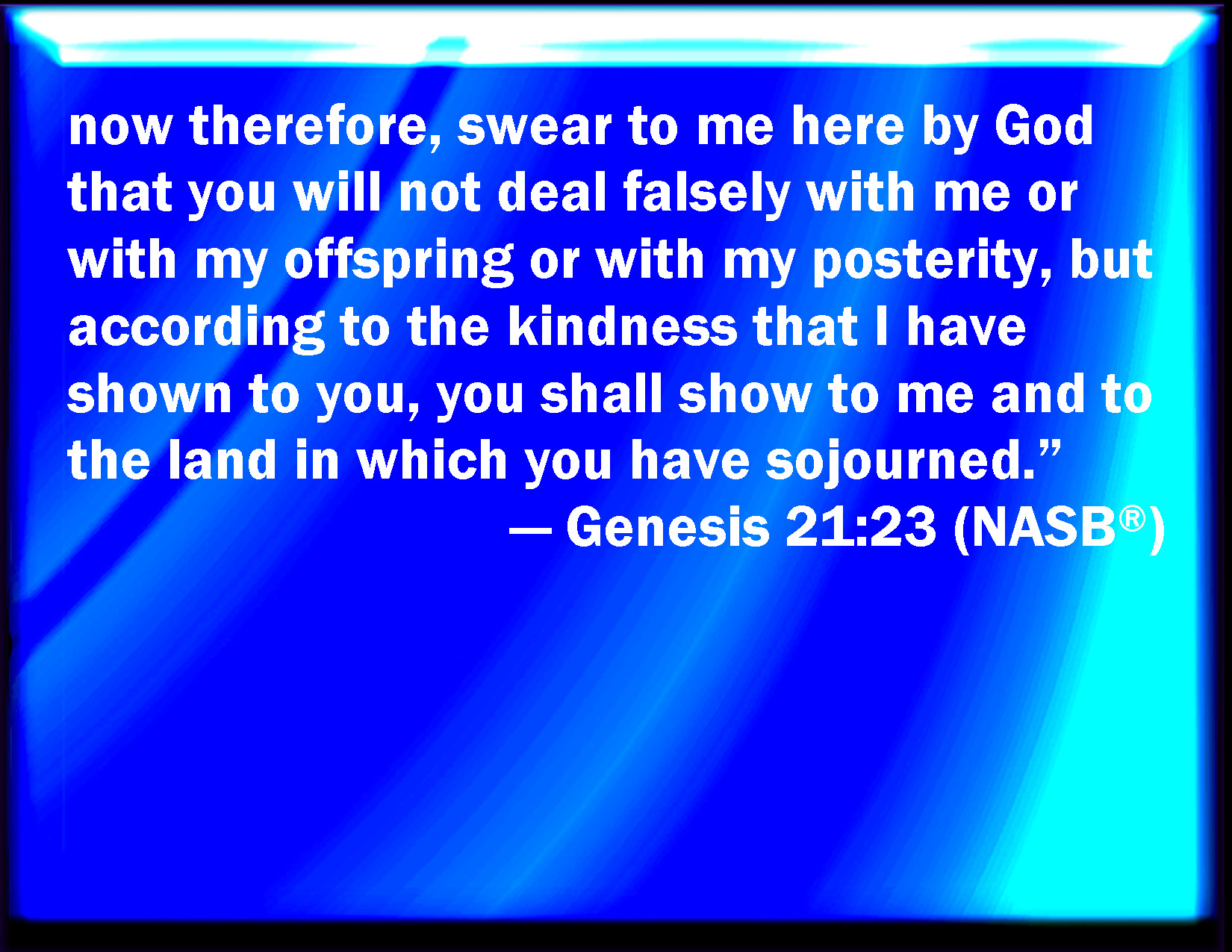 Bible Verse Slide Genesis 21:23 Now therefore swear to me here by God that you will not deal falsely with me, nor with my son, nor with my son's son: but according to the kindness that I have done to you, you shall do to me, and to the land wherein you have sojourned. KJV: Now therefore swear unto me here by God that thou wilt not deal falsely with me, nor with my son, nor with my son's son: but according to the kindness that I have done unto thee, thou shalt do unto me, and to the land wherein thou hast sojourned. DRB: Swear therefore by God, that thou wilt not hurt me, nor my posterity, nor my stock: but according to the kindness that I have done to thee, thou shalt do to me, and to the land wherein thou hast lived a stranger. DBT: And now swear to me here by God that thou wilt not deal deceitfully with me, nor with my son, nor with my grandson. According to the kindness that I have done to thee, thou shalt do to me, and to the land in which thou sojournest. ERV: now therefore swear unto me here by God that thou wilt not deal falsely with me, nor with my son, nor with my son's son: but according to the kindness that I have done unto thee, thou shalt do unto me, and to the land wherein thou hast sojourned. WBT: Now therefore swear to me here by God, that thou wilt not deal falsely with me, nor with my son, nor with my son's son: but according to the kindness that I have done to thee, thou shalt do to me, and to the land in which thou hast sojourned. WEB: Now, therefore, swear to me here by God that you will not deal falsely with me, nor with my son, nor with my son's son. But according to the kindness that I have done to you, you shall do to me, and to the land in which you have lived as a foreigner." YLT: and now, swear to me by God here: thou dost not lie to me, or to my continuator, or to my successor; according to the kindness which I have done with thee thou dost with me, and with the land in which thou hast sojourned.'Links Genesis 21:23 NIV • Genesis 21:23 NLT • Genesis 21:23 ESV • Genesis 21:23 NASB • Genesis 21:23 KJV • Genesis 21:23 Interlinear • Genesis 21:23 Commentaries • Genesis 21:23 Parallel Texts • Genesis 21:23 Bible Apps • Genesis 21:23 Parallel • Bible Hub |