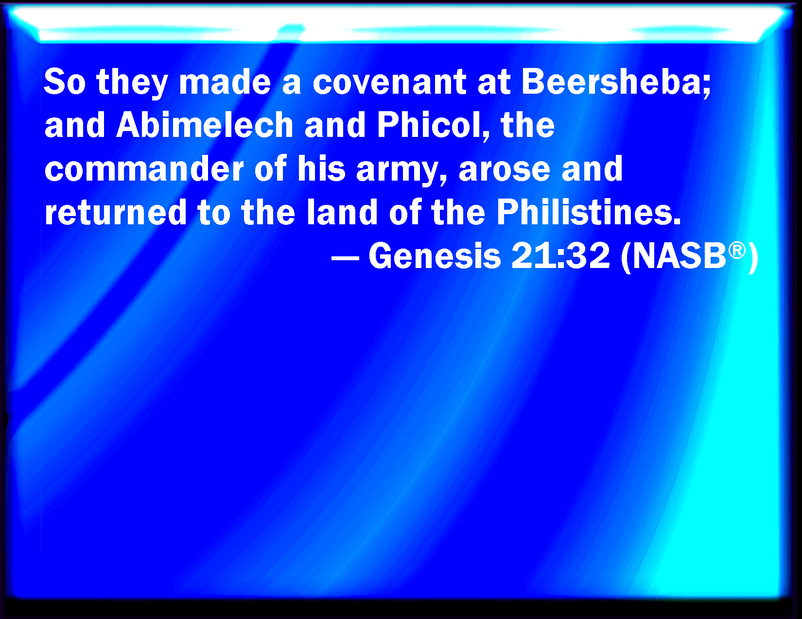 Bible Verse Slide Genesis 21:32 Thus they made a covenant at Beersheba: then Abimelech rose up, and Phichol the chief captain of his host, and they returned into the land of the Philistines. KJV: Thus they made a covenant at Beersheba: then Abimelech rose up, and Phichol the chief captain of his host, and they returned into the land of the Philistines. DRB: And they made a league for the well of oath. DBT: And they made a covenant at Beer-sheba. And Abimelech rose up, and Phichol the captain of his host, and returned into the land of the Philistines. ERV: So they made a covenant at Beer-sheba: and Abimelech rose up, and Phicol the captain of his host, and they returned into the land of the Philistines. WBT: Thus they made a covenant at Beer-sheba: Then Abimelech arose, and Phichol the chief captain of his host, and they returned into the land of the Philistines. WEB: So they made a covenant at Beersheba. Abimelech rose up with Phicol, the captain of his army, and they returned into the land of the Philistines. YLT: And they make a covenant in Beer-Sheba, and Abimelech riseth — Phichol also, head of his host — and they turn back unto the land of the Philistines;Links Genesis 21:32 NIV • Genesis 21:32 NLT • Genesis 21:32 ESV • Genesis 21:32 NASB • Genesis 21:32 KJV • Genesis 21:32 Interlinear • Genesis 21:32 Commentaries • Genesis 21:32 Parallel Texts • Genesis 21:32 Bible Apps • Genesis 21:32 Parallel • Bible Hub |