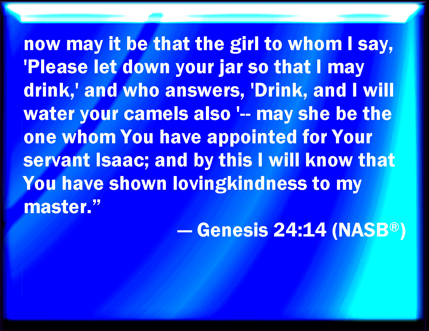 Bible Verse Slide Genesis 24:14 And let it come to pass, that the damsel to whom I shall say, Let down your pitcher, I pray you, that I may drink; and she shall say, Drink, and I will give your camels drink also: let the same be she that you have appointed for your servant Isaac; and thereby shall I know that you have showed kindness to my master. KJV: And let it come to pass, that the damsel to whom I shall say, Let down thy pitcher, I pray thee, that I may drink; and she shall say, Drink, and I will give thy camels drink also: let the same be she that thou hast appointed for thy servant Isaac; and thereby shall I know that thou hast shewed kindness unto my master. DRB: Now, therefore, the maid to whom I shall say: Let down thy pitcher that I may drink: and she shall answer, Drink, and I will give thy camels drink also: let it be the same whom thou hast provided for thy servant Isaac: and by this I shall understand, that thou hast shown kindness to my master. DBT: And let it come to pass, that the maiden to whom I shall say, Let down thy pitcher, I pray thee, that I may drink, and who will say, Drink, and I will give thy camels drink also, be she whom thou hast appointed for thy servant Isaac; and hereby I shall know that thou hast dealt kindly with my master. ERV: and let it come to pass, that the damsel to whom I shall say, Let down thy pitcher, I pray thee, that I may drink; and she shall say, Drink, and I will give thy camels drink also: let the same be she that thou hast appointed for thy servant Isaac; and thereby shall I know that thou hast shewed kindness unto my master. WBT: And let it come to pass, that the damsel to whom I shall say, Let down thy pitcher, I pray thee, that I may drink; and she shall say, Drink, and I will give thy camels drink also: let the same be she that thou hast appointed for thy servant Isaac; and by that shall I know that thou hast shown kindness to my master. WEB: Let it happen, that the young lady to whom I will say, 'Please let down your pitcher, that I may drink,' and she will say, 'Drink, and I will also give your camels a drink,'—let her be the one you have appointed for your servant Isaac. By this I will know that you have shown kindness to my master." YLT: and it hath been, the young person unto whom I say, Incline, I pray thee, thy pitcher, and I drink, and she hath said, Drink, and I water also thy camels) — her Thou hast decided for Thy servant, for Isaac; and by it I know that Thou hast done kindness with my lord.'Links Genesis 24:14 NIV • Genesis 24:14 NLT • Genesis 24:14 ESV • Genesis 24:14 NASB • Genesis 24:14 KJV • Genesis 24:14 Interlinear • Genesis 24:14 Commentaries • Genesis 24:14 Parallel Texts • Genesis 24:14 Bible Apps • Genesis 24:14 Parallel • Bible Hub |