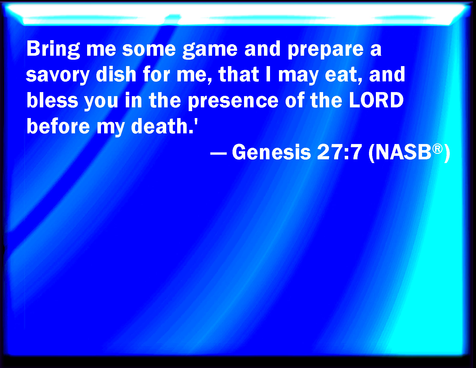 Bible Verse Slide Genesis 27:7 Bring me venison, and make me savoury meat, that I may eat, and bless you before the LORD before my death. KJV: Bring me venison, and make me savoury meat, that I may eat, and bless thee before the LORD before my death. DRB: Bring me of thy hunting, and make me meats that I may eat, and bless thee in the sight of the Lord, before I die. DBT: Bring me venison, and prepare me a savoury dish, that I may eat, and bless thee before Jehovah, before my death. ERV: Bring me venison, and make me savoury meat, that I may eat, and bless thee before the LORD before my death. WBT: Bring me venison, and make me savory meat, that I may eat, and bless thee before the LORD, before my death. WEB: 'Bring me venison, and make me savory food, that I may eat, and bless you before Yahweh before my death.' YLT: Bring for me provision, and make for me tasteful things, and I do eat, and bless thee before Jehovah before my death.Links Genesis 27:7 NIV • Genesis 27:7 NLT • Genesis 27:7 ESV • Genesis 27:7 NASB • Genesis 27:7 KJV • Genesis 27:7 Interlinear • Genesis 27:7 Commentaries • Genesis 27:7 Parallel Texts • Genesis 27:7 Bible Apps • Genesis 27:7 Parallel • Bible Hub |