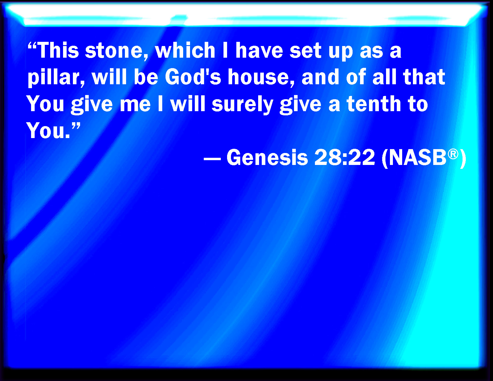 Bible Verse Slide Genesis 28:22 And this stone, which I have set for a pillar, shall be God's house: and of all that you shall give me I will surely give the tenth to you. KJV: And this stone, which I have set for a pillar, shall be God's house: and of all that thou shalt give me I will surely give the tenth unto thee. DRB: And this stone, which I have set up for a title, shall called the house of God: and of all things that thou shalt give to me, I will offer tithes to thee. DBT: And this stone, which I have set up for a pillar, shall be God's house; and of all that thou wilt give me I will without fail give the tenth to thee. ERV: and this stone, which I have set up for a pillar, shall be God's house: and of all that thou shalt give me I will surely give the tenth unto thee. WBT: And this stone, which I have set for a pillar, shall be God's house: and of all that thou shalt give me, I will surely give the tenth to thee. WEB: then this stone, which I have set up for a pillar, will be God's house. Of all that you will give me I will surely give the tenth to you." YLT: then this stone which I have made a standing pillar is a house of God, and all that Thou dost give to me — tithing I tithe to Thee.'Links Genesis 28:22 NIV • Genesis 28:22 NLT • Genesis 28:22 ESV • Genesis 28:22 NASB • Genesis 28:22 KJV • Genesis 28:22 Interlinear • Genesis 28:22 Commentaries • Genesis 28:22 Parallel Texts • Genesis 28:22 Bible Apps • Genesis 28:22 Parallel • Bible Hub |