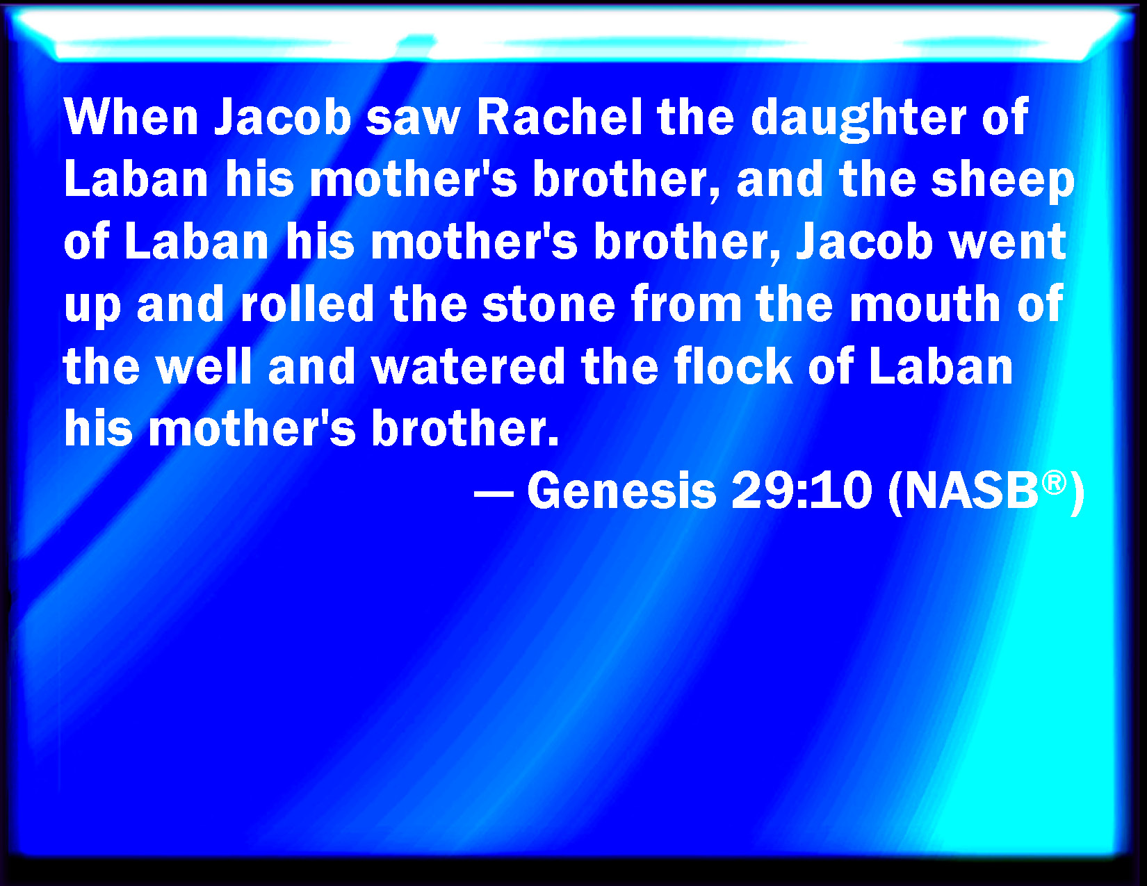 Bible Verse Slide Genesis 29:10 And it came to pass, when Jacob saw Rachel the daughter of Laban his mother's brother, and the sheep of Laban his mother's brother, that Jacob went near, and rolled the stone from the well's mouth, and watered the flock of Laban his mother's brother. KJV: And it came to pass, when Jacob saw Rachel the daughter of Laban his mother's brother, and the sheep of Laban his mother's brother, that Jacob went near, and rolled the stone from the well's mouth, and watered the flock of Laban his mother's brother. DRB: And when Jacob saw her, and knew her to be his cousin-german, and that they were the sheep of Laban, his uncle: he removed the stone wherewith the well was closed. DBT: And it came to pass when Jacob saw Rachel the daughter of Laban his mother's brother, and the sheep of Laban his mother's brother, that Jacob went near, and rolled the stone from the mouth of the well, and watered the sheep of Laban his mother's brother. ERV: And it came to pass, when Jacob saw Rachel the daughter of Laban his mother's brother, and the sheep of Laban his mother's brother, that Jacob went near, and rolled the stone from the well's mouth, and watered the flock of Laban his mother's brother. WBT: And it came to pass, when Jacob saw Rachel, the daughter of Laban his mother's brother, and the sheep of Laban his mother's brother; that Jacob went near, and rolled the stone from the well's mouth, and watered the flock of Laban his mother's brother. WEB: It happened, when Jacob saw Rachel the daughter of Laban, his mother's brother, and the sheep of Laban, his mother's brother, that Jacob went near, and rolled the stone from the well's mouth, and watered the flock of Laban his mother's brother. YLT: and it cometh to pass when Jacob hath seen Rachel, daughter of Laban his mother's brother, and the flock of Laban his mother's brother, that Jacob cometh nigh and rolleth the stone from off the mouth of the well, and watereth the flock of Laban his mother's brother.Links Genesis 29:10 NIV • Genesis 29:10 NLT • Genesis 29:10 ESV • Genesis 29:10 NASB • Genesis 29:10 KJV • Genesis 29:10 Interlinear • Genesis 29:10 Commentaries • Genesis 29:10 Parallel Texts • Genesis 29:10 Bible Apps • Genesis 29:10 Parallel • Bible Hub |
