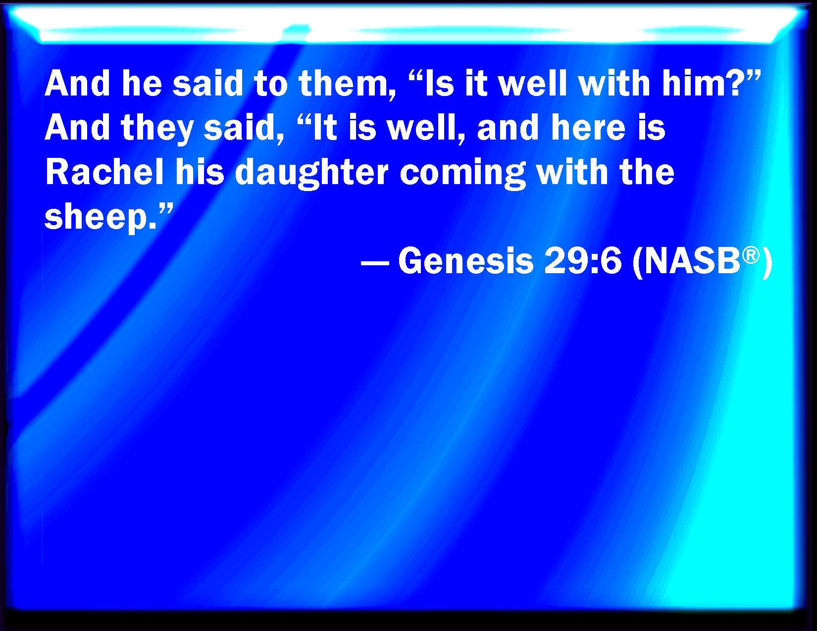 Bible Verse Slide Genesis 29:6 And he said to them, Is he well? And they said, He is well: and, behold, Rachel his daughter comes with the sheep. KJV: And he said unto them, Is he well? And they said, He is well: and, behold, Rachel his daughter cometh with the sheep. DRB: He said: Is he in health? He is in health, say they: and behold Rachel his daughter cometh with his flock. DBT: And he said to them, Is he well? And they said, He is well; and behold, there comes Rachel his daughter with the sheep. ERV: And he said unto them, Is it well with him? And they said, It is well: and, behold, Rachel his daughter cometh with the sheep. WBT: And he said to them, Is he well? And they said, He is well: and behold, Rachel his daughter cometh with the sheep. WEB: He said to them, "Is it well with him?" They said, "It is well. See, Rachel, his daughter, is coming with the sheep." YLT: And he saith to them, 'Hath he peace?' and they say, 'Peace; and lo, Rachel his daughter is coming with the flock.'Links Genesis 29:6 NIV • Genesis 29:6 NLT • Genesis 29:6 ESV • Genesis 29:6 NASB • Genesis 29:6 KJV • Genesis 29:6 Interlinear • Genesis 29:6 Commentaries • Genesis 29:6 Parallel Texts • Genesis 29:6 Bible Apps • Genesis 29:6 Parallel • Bible Hub |