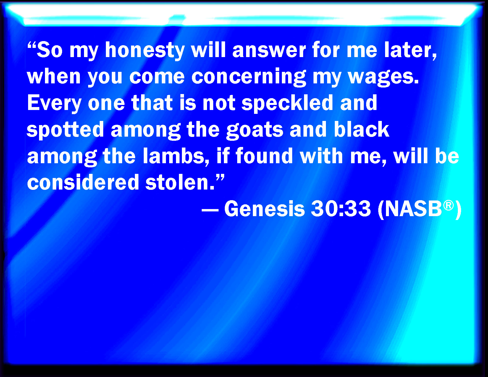 Bible Verse Slide Genesis 30:33 So shall my righteousness answer for me in time to come, when it shall come for my hire before your face: every one that is not speckled and spotted among the goats, and brown among the sheep, that shall be counted stolen with me. KJV: So shall my righteousness answer for me in time to come, when it shall come for my hire before thy face: every one that is not speckled and spotted among the goats, and brown among the sheep, that shall be counted stolen with me. DRB: And my justice shall answer for me to morrow before thee when the time of the bargain shall come: and all that is not of divers colours, and spotted, and brown, as well among the sheep as among the goats, shall accuse me of theft. DBT: And my righteousness shall answer for me hereafter, when thou comest about my hire, before thy face: all that is not speckled and spotted among the goats, and brown among the lambs, let that be stolen with me. ERV: So shall my righteousness answer for me hereafter, when thou shalt come concerning my hire that is before thee: every one that is not speckled and spotted among the goats, and black among the sheep, that if found with me shall be counted stolen. WBT: So shall my righteousness answer for me in time to come, when it shall come for my hire before thy face: every one that is not speckled and spotted among the goats, and brown among the sheep, that shall be accounted stolen with me. WEB: So my righteousness will answer for me hereafter, when you come concerning my hire that is before you. Every one that is not speckled and spotted among the goats, and black among the sheep, that might be with me, will be counted stolen." YLT: and my righteousness hath answered for me in the day to come, when it cometh in for my hire before thy face; — every one which is not speckled and spotted among my goats, and brown among my lambs — it is stolen with me.'Links Genesis 30:33 NIV • Genesis 30:33 NLT • Genesis 30:33 ESV • Genesis 30:33 NASB • Genesis 30:33 KJV • Genesis 30:33 Interlinear • Genesis 30:33 Commentaries • Genesis 30:33 Parallel Texts • Genesis 30:33 Bible Apps • Genesis 30:33 Parallel • Bible Hub |