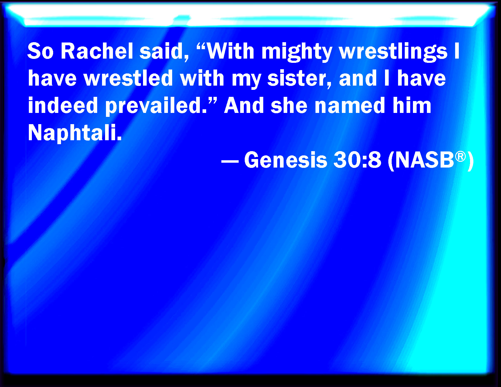 Bible Verse Slide Genesis 30:8 And Rachel said, With great wrestlings have I wrestled with my sister, and I have prevailed: and she called his name Naphtali. KJV: And Rachel said, With great wrestlings have I wrestled with my sister, and I have prevailed: and she called his name Naphtali. DRB: For whom Rachel said: God hath compared me with my sister, and I have prevailed: and she called him Nephtali. DBT: And Rachel said, Wrestlings of God have I wrestled with my sister, and have prevailed; and she called his name Naphtali. ERV: And Rachel said, With mighty wrestlings have I wrestled with my sister, and have prevailed: and she called his name Naphtali. WBT: And Rachel said, With great wrestlings have I wrestled with my sister, and I have prevailed: and she called his name Naphtali. WEB: Rachel said, "With mighty wrestlings have I wrestled with my sister, and have prevailed." She named him Naphtali. YLT: and Rachel saith, 'With wrestlings of God I have wrestled with my sister, yea, I have prevailed;' and she calleth his name Napthali.Links Genesis 30:8 NIV • Genesis 30:8 NLT • Genesis 30:8 ESV • Genesis 30:8 NASB • Genesis 30:8 KJV • Genesis 30:8 Interlinear • Genesis 30:8 Commentaries • Genesis 30:8 Parallel Texts • Genesis 30:8 Bible Apps • Genesis 30:8 Parallel • Bible Hub |
