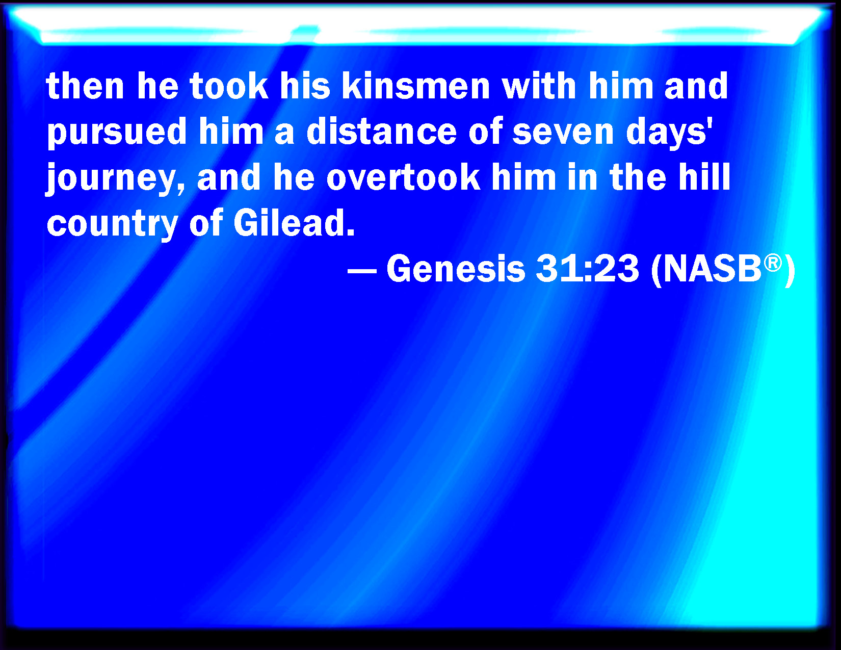 Bible Verse Slide Genesis 31:23 And he took his brothers with him, and pursued after him seven days' journey; and they overtook him in the mount Gilead. KJV: And he took his brethren with him, and pursued after him seven days' journey; and they overtook him in the mount Gilead. DRB: And he took his brethren with him, and pursued after him seven days; and overtook him in the mount of Galaad. DBT: And he took his brethren with him, and pursued after him seven days' journey, and overtook him on mount Gilead. ERV: And he took his brethren with him, and pursued after him seven days' journey; and he overtook him in the mountain of Gilead. WBT: And he took his brethren with him, and pursued after him seven days' journey: and they overtook him in the mount Gilead. WEB: He took his relatives with him, and pursued after him seven days' journey. He overtook him in the mountain of Gilead. YLT: and he taketh his brethren with him, and pursueth after him a journey of seven days, and overtaketh him in the mount of Gilead.Links Genesis 31:23 NIV • Genesis 31:23 NLT • Genesis 31:23 ESV • Genesis 31:23 NASB • Genesis 31:23 KJV • Genesis 31:23 Interlinear • Genesis 31:23 Commentaries • Genesis 31:23 Parallel Texts • Genesis 31:23 Bible Apps • Genesis 31:23 Parallel • Bible Hub |